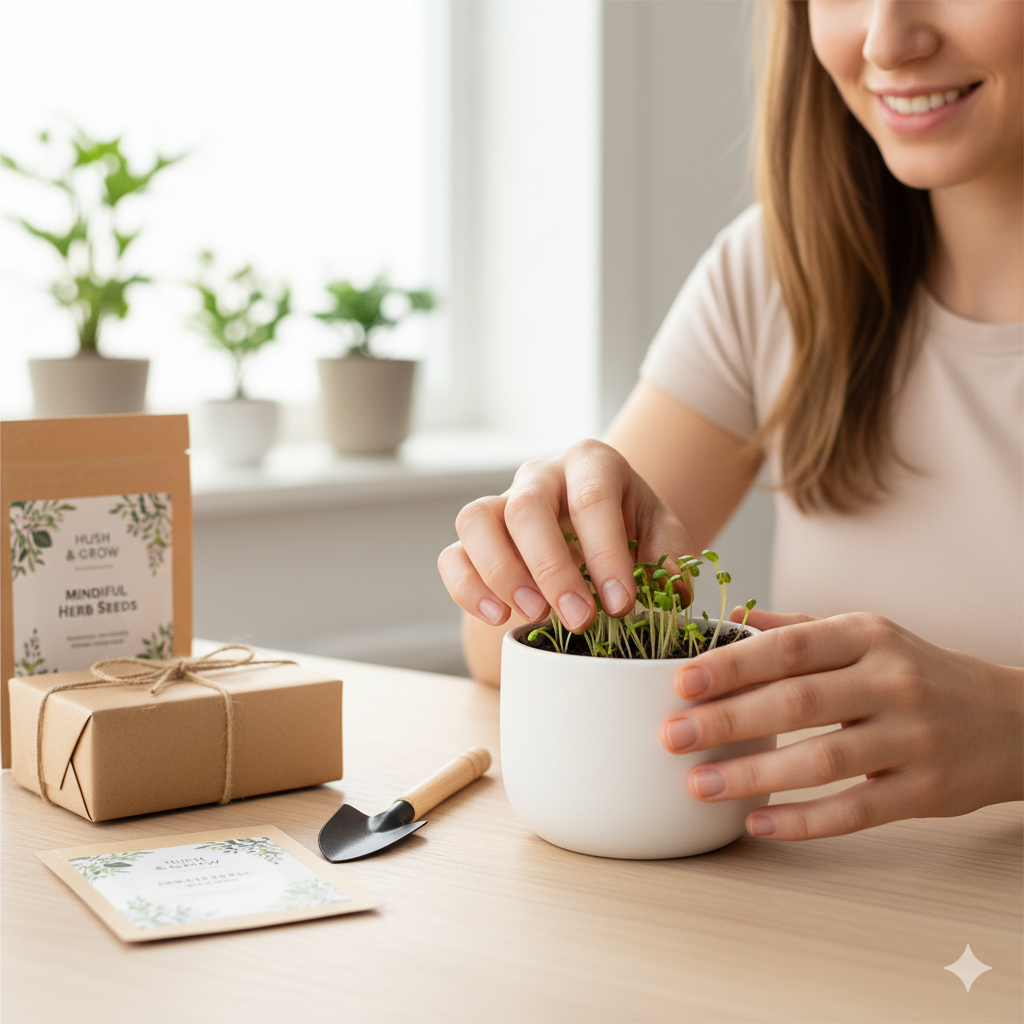 A: We Guarantee Your Growth, Not Just the Delivery. We specialize in resilient plants from our Inner Sanctuary collection (like ZZ and Snake Plants) and guarantee success for beginners. Every plant purchase includes a "Quick Care Card," and our The Gift of HUSH & GROW kits come with fool-proof, step-by-step guides. We are dedicated to turning your initial nervousness into mindful joy and confidence.