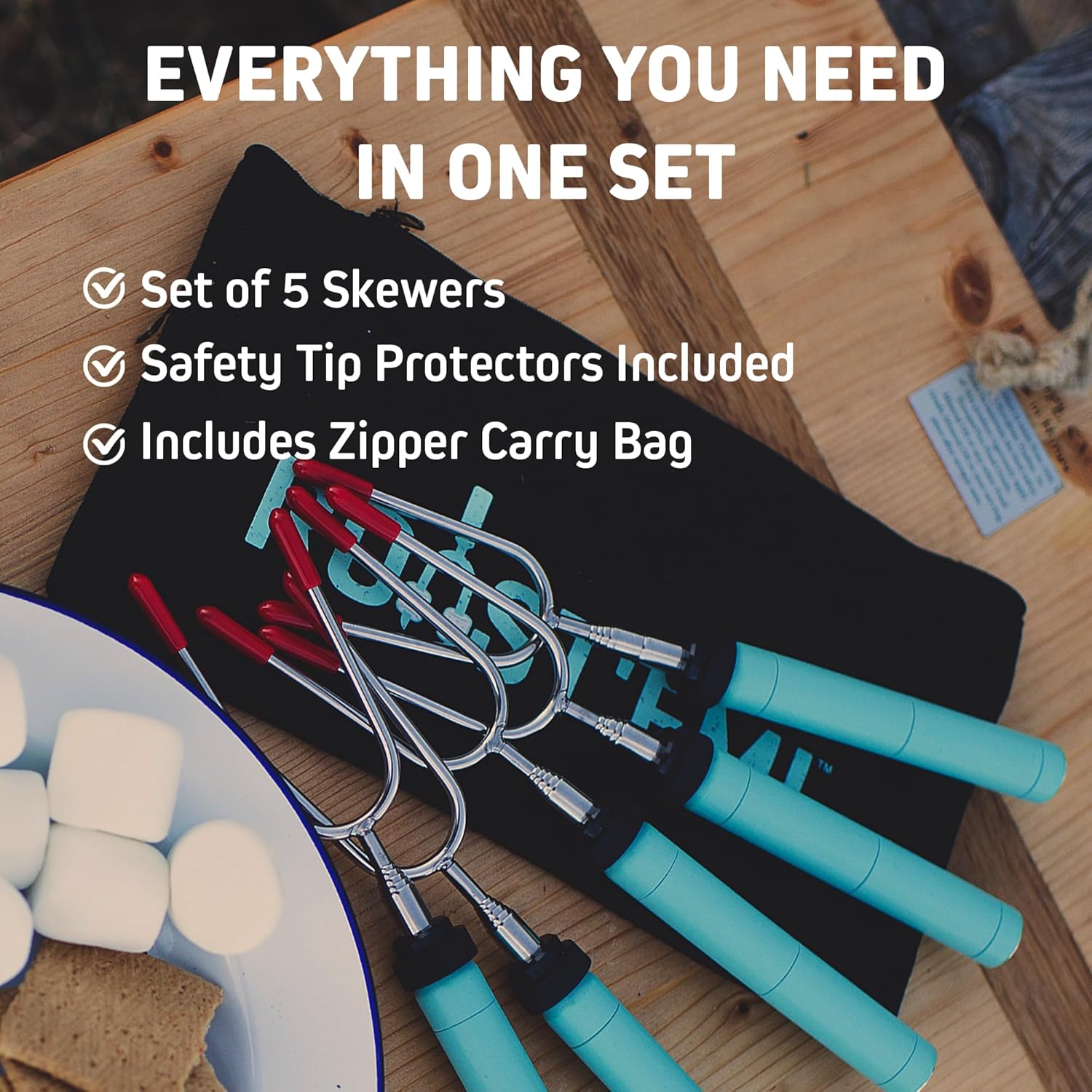 - SAFE & FAMILY-FRIENDLY: Designed with food-contact grade stainless steel and protective rubber caps, these smore sticks are safe for kids and adults alike. Enjoy worry-free campfires, whether at the fire pit, backyard, or campground.