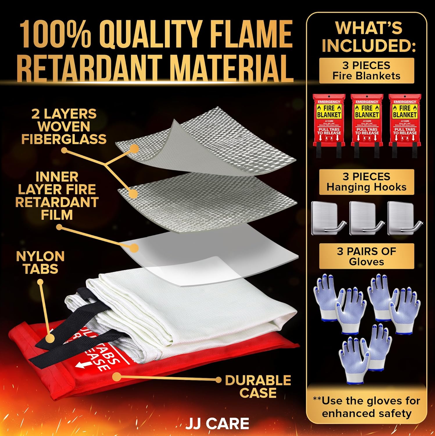 JJ CARE Fire Blanket – 3 Packs with Hooks and Gloves – Emergency Fire Blanket for Home & Kitchen, High Heat Resistant Fire Suppression Blankets for Home Safety, Kitchen, and Camping