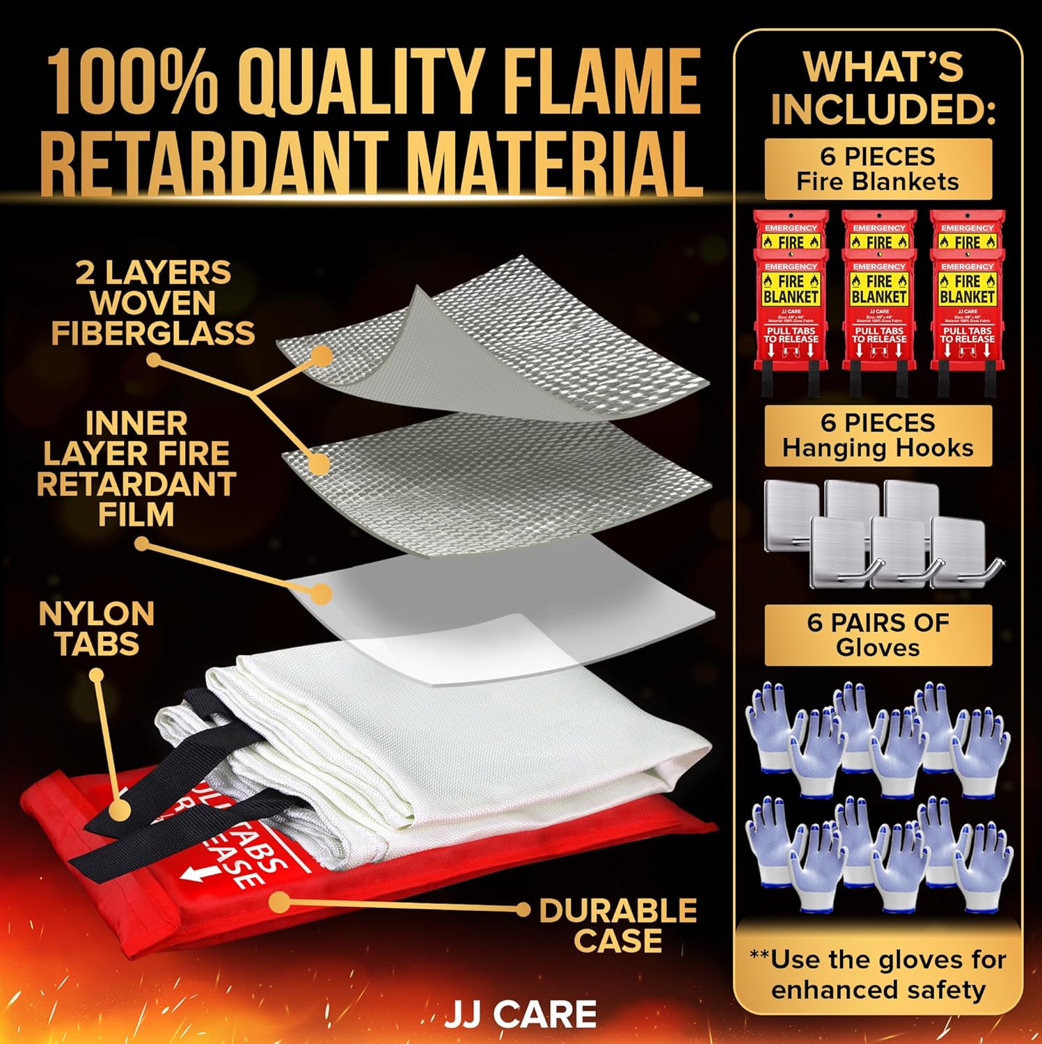 JJ CARE Fire Blanket – 6 Packs with Hooks and Gloves – Emergency Fire Blanket for Home & Kitchen, High Heat Resistant Fire Suppression Blankets for Home Safety, Kitchen, and Camping