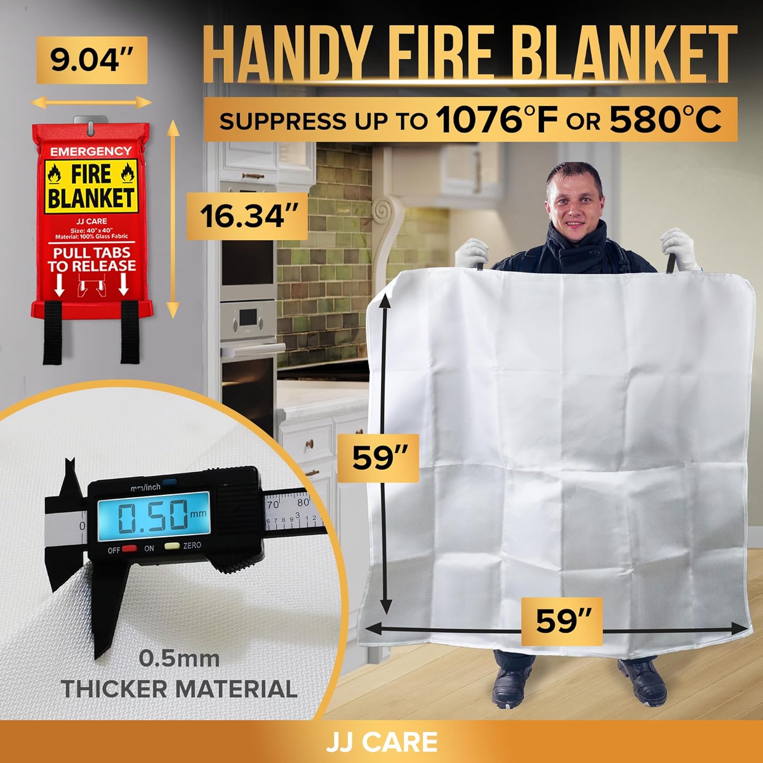 - Reliable Fire Safety: Keep your home and loved ones safe with JJ Care’s high-quality emergency fire blanket! Made from premium fire-resistant materials, featuring dual-layer fiberglass and a fire-retardant film, it meets EN-1869:1997 standards and withstands extreme heat up to 1076℉ (580℃). Easy to use and a must-have for added safety and Peace of Mind!