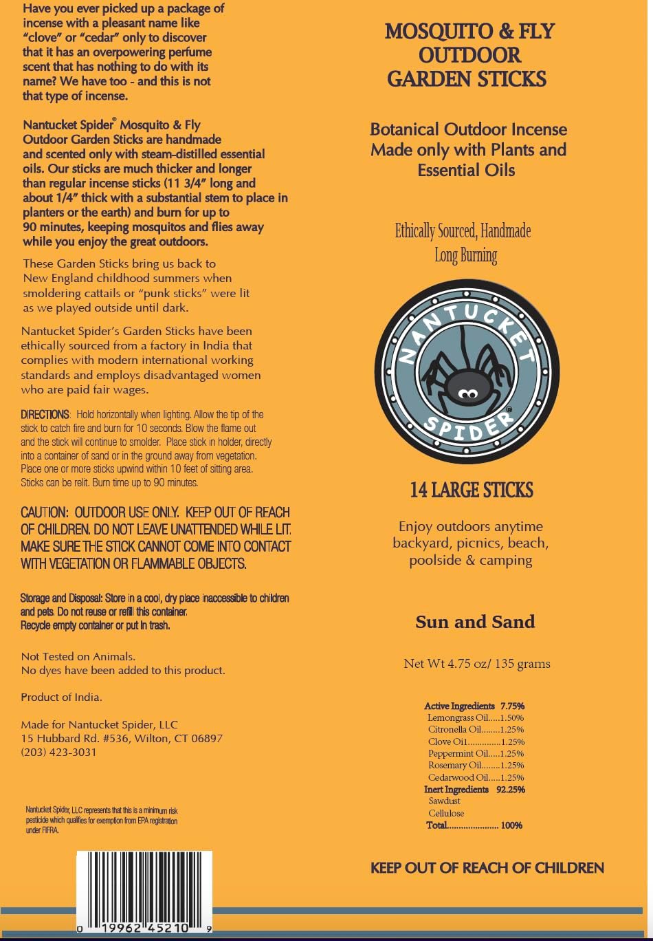 - Long Burning Time: Nantucket Spider mosquito repellent incense sticks are 12 inches long, providing a long-lasting burn for about ninety minutes. Easy to extinguish and relight for shorter periods.