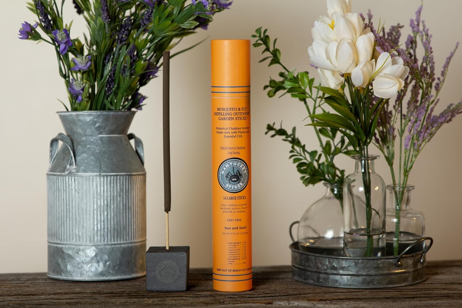 - Combo Pack: Our repellent mosquito sticks and incense holders are ethically sourced and made of high-quality natural materials. Nantucket Spider mosquito sticks are made with steam-distilled, cold-pressed essential oils and plant ingredients without any artificial scents, harmful chemicals, or dyes. Slate Block incense holders are beautifully crafted and made to safely hold Nantucket Spider mosquito sticks.