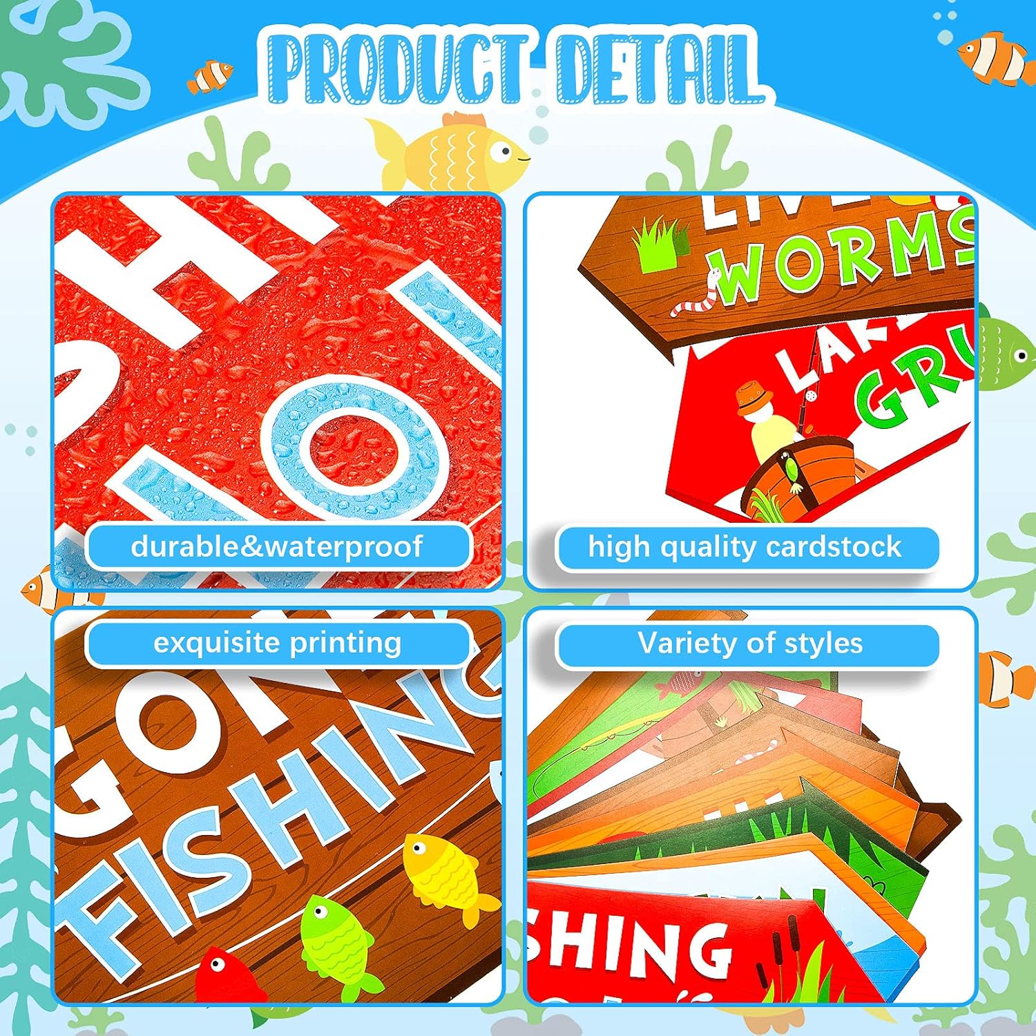 - Stylish Design: these fishing party supplies are printed with assorted fishing theme signs, like fish, fish float, fishing rod, etc., the words in big fonts are easy and clear for you to notice and read; The bright colors of yard sign can adorn your house and convey the pleasant party atmosphere effectively