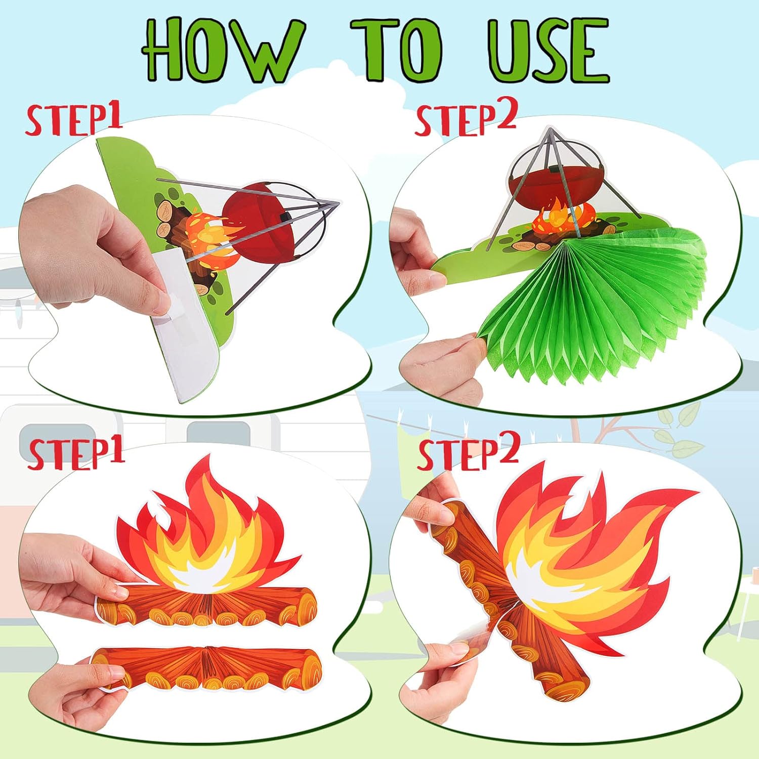 - Enough quantity: you will get 12 pieces of camping themed party decorations, including 8 honeycomb centerpieces and 4 standing camping theme cards, which adopt various camping patterns; Enough quantity and styles can easily satisfy your various decoration needs