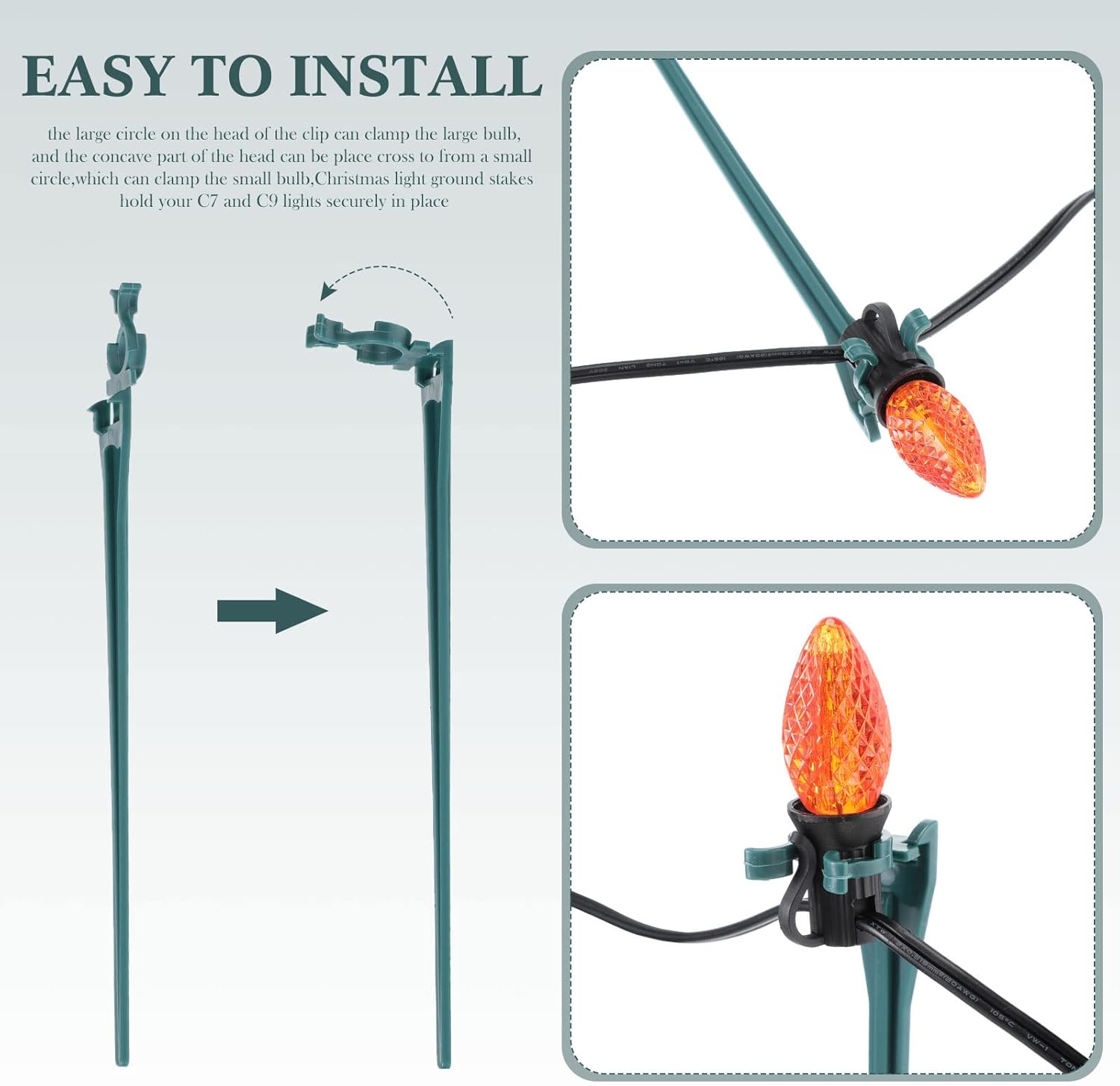 - Suitable type: these Christmas light lawn stakes can accommodate either LED or incandescent miniature and C-series lights, and they can support these bulbs well, you can buy them at ease