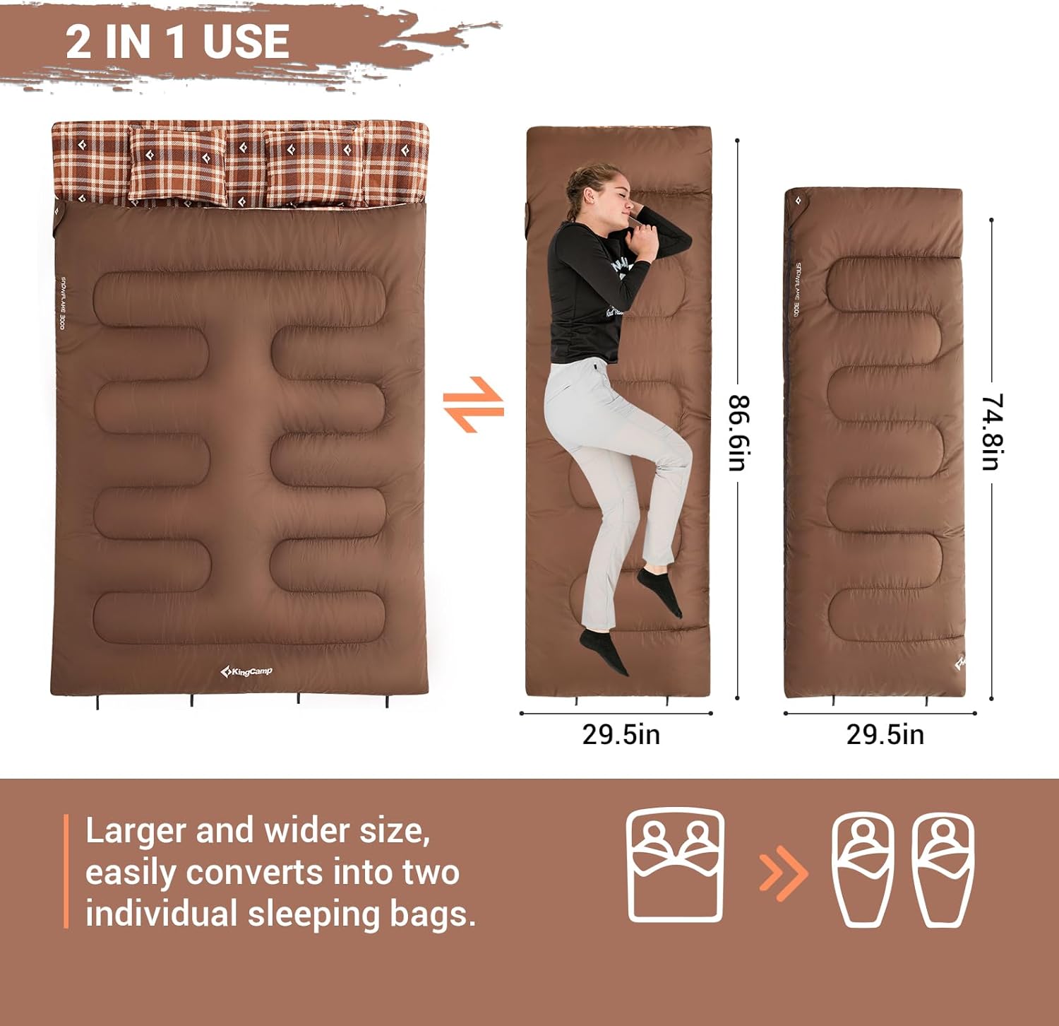 - USE AS ONE DOUBLE or TWO SINGLE BAGS: Our queen sleeping bag is designed for ultimate flexibility! It can be detached into two individual sleeping bags with zippers on both sides, making it perfect for solo camping or couples. Fully unzip it to transform it into two large blankets for movie nights, picnics, or outdoor concerts.