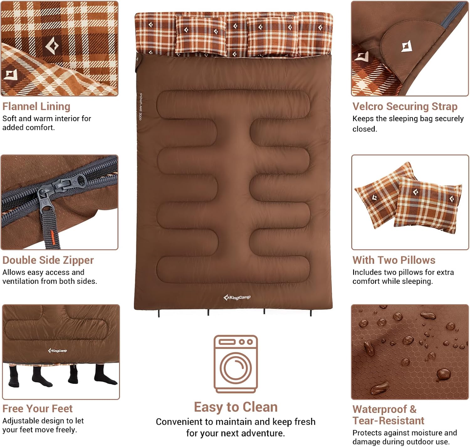 KingCamp Double Sleeping Bag for Adults, Queen Size 2 Person XXL Flannel Sleeping Bag, Waterproof Lightweight Flannel Quilt with 2 Pillows, Perfect for Couples Family Camping Hiking
