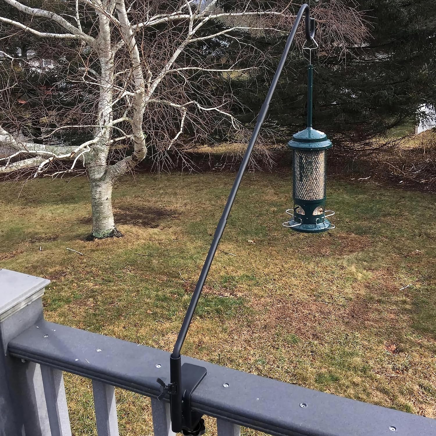 - Smart & Efficient Design - This angled hook can be repositioned and adjusted 360 degree without fuss and keeps your feeder in plain sight for perfect viewing from anywhere on your porch. And watch bird activity from the comfort of your deck. 36 inch long pole makes it difficult for squirrels or any other animals to reach the bird seeds.