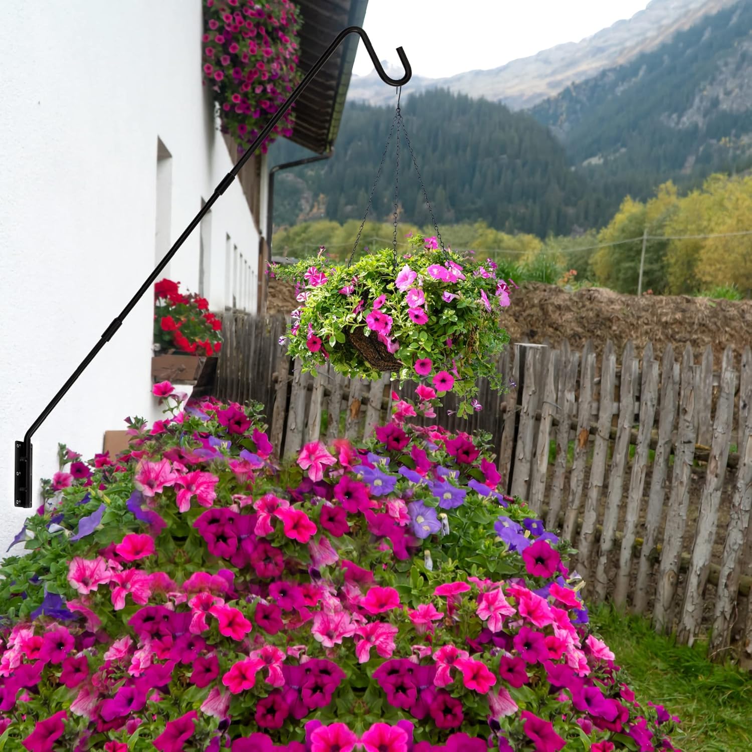 - Premium Quality - Our weather-proof powder-coated metal maintains its subtle black color and quality season after season. Solid bracket and curved shepherd hook helps securely hold items. Suggested max hanging weight: 11 lbs (5 kg).