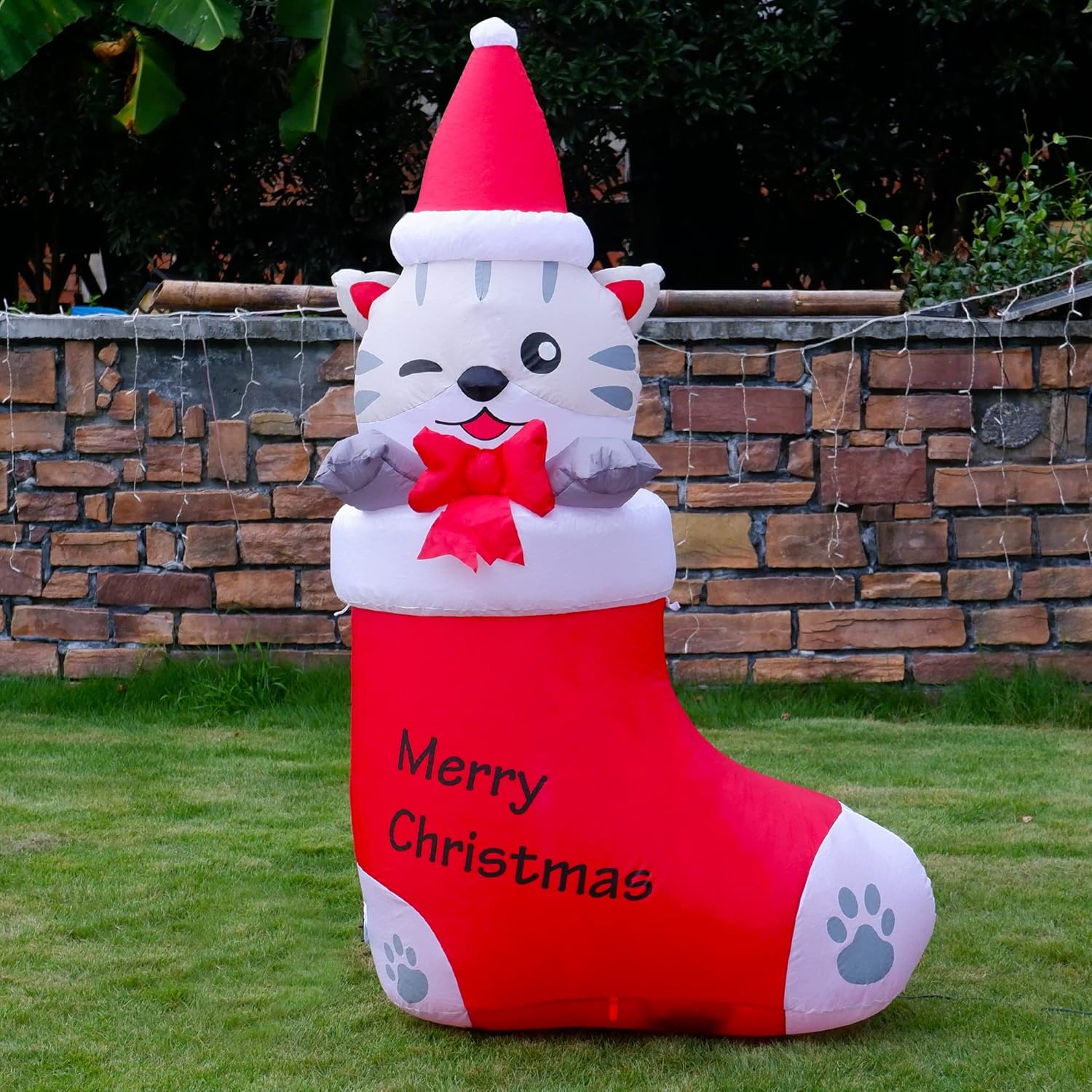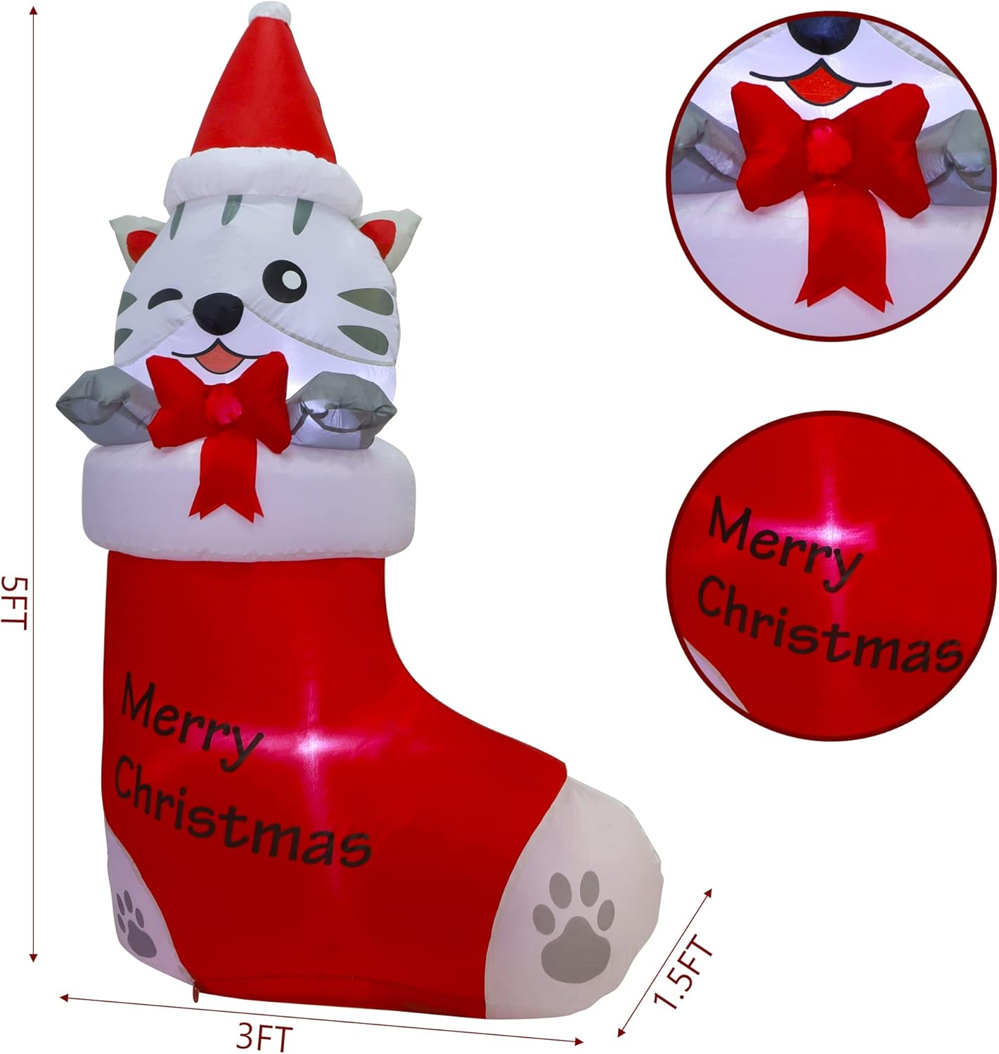 - Christmas Inflatable Decorations: Our Xmas inflatable lighted kitty hiding in Christmas stocking is 5 feet tall when inflated. It adds an eye-catching centerpiece to your holiday seasonal layout and makes it big and attractive Christmas decorations around. With led lights inside, light up at night and make your home a new sight in your neighborhood