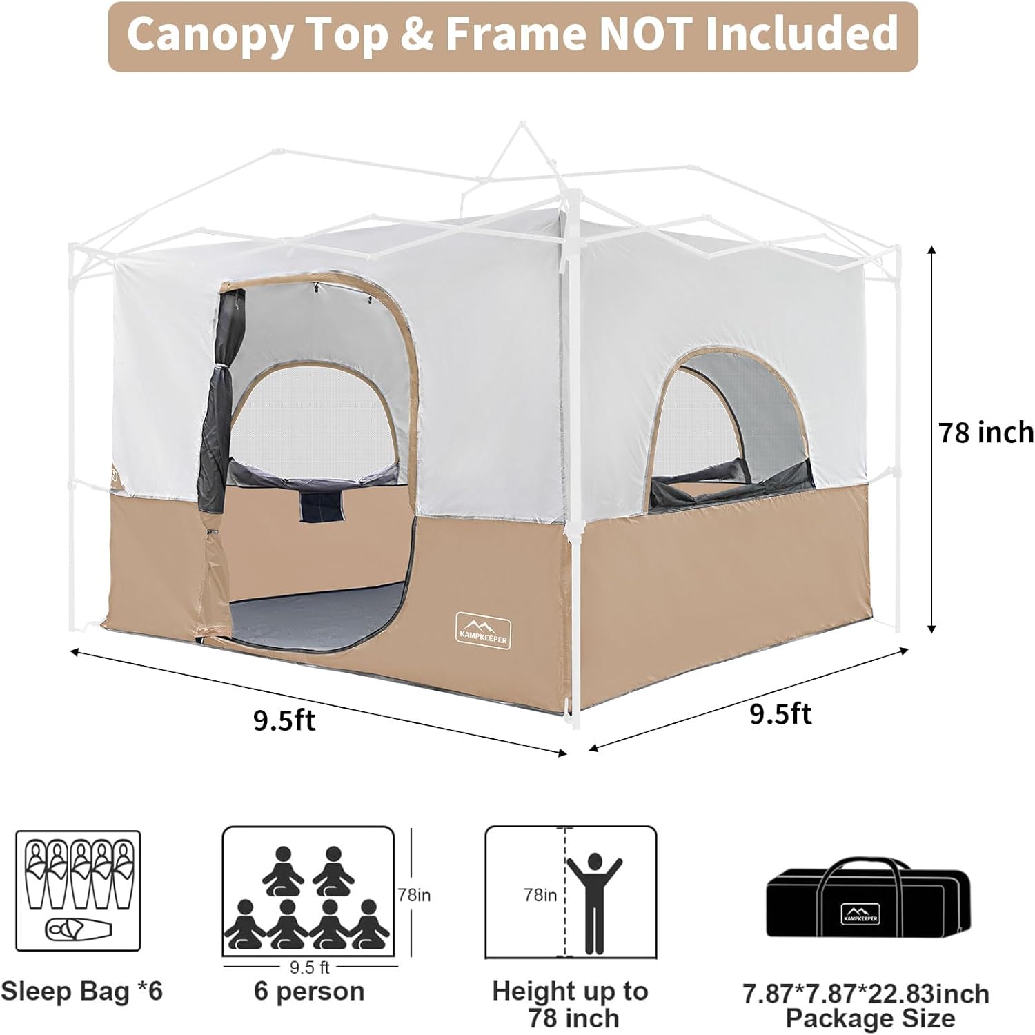 - Spacious Accommodations: Designed to fit a 10x10 straight-leg canopy, with dimensions of 9.5'L x 9.5'W x 78"H, the canopy inner tent comfortably fits 2 queen air mattresses and more, accommodating up to 6 adults. There is plenty of room to stand, walk and stretch while enjoying the great outdoors
