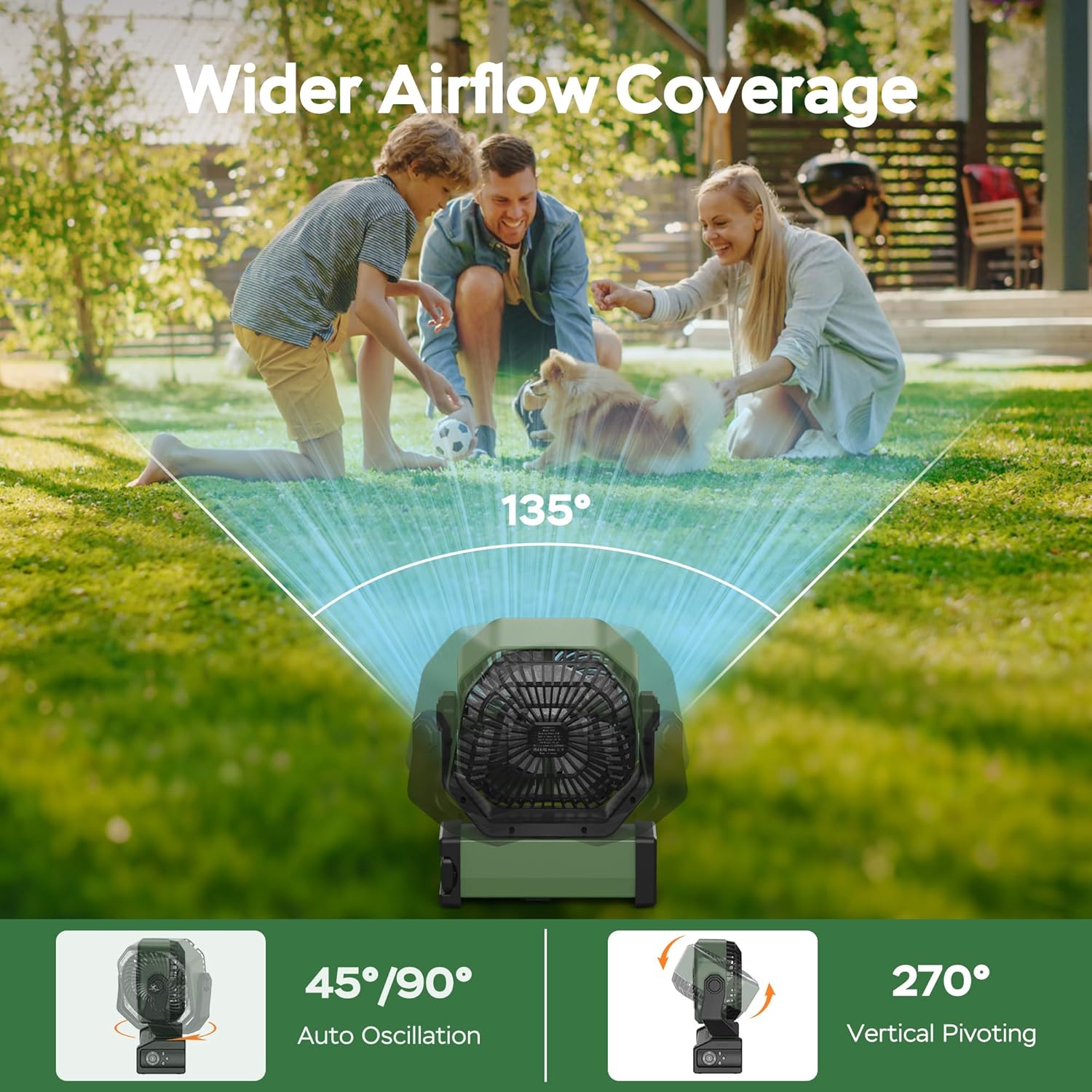 KITWLEMEN Camping Fan with Light - 20000mAh Rechargeable Battery Fan, 60Hrs Max Run Time, 4 Speeds, Timer, Auto Oscillation, 270° Pivot & Hook for Camping, Power Outage, Hurricane