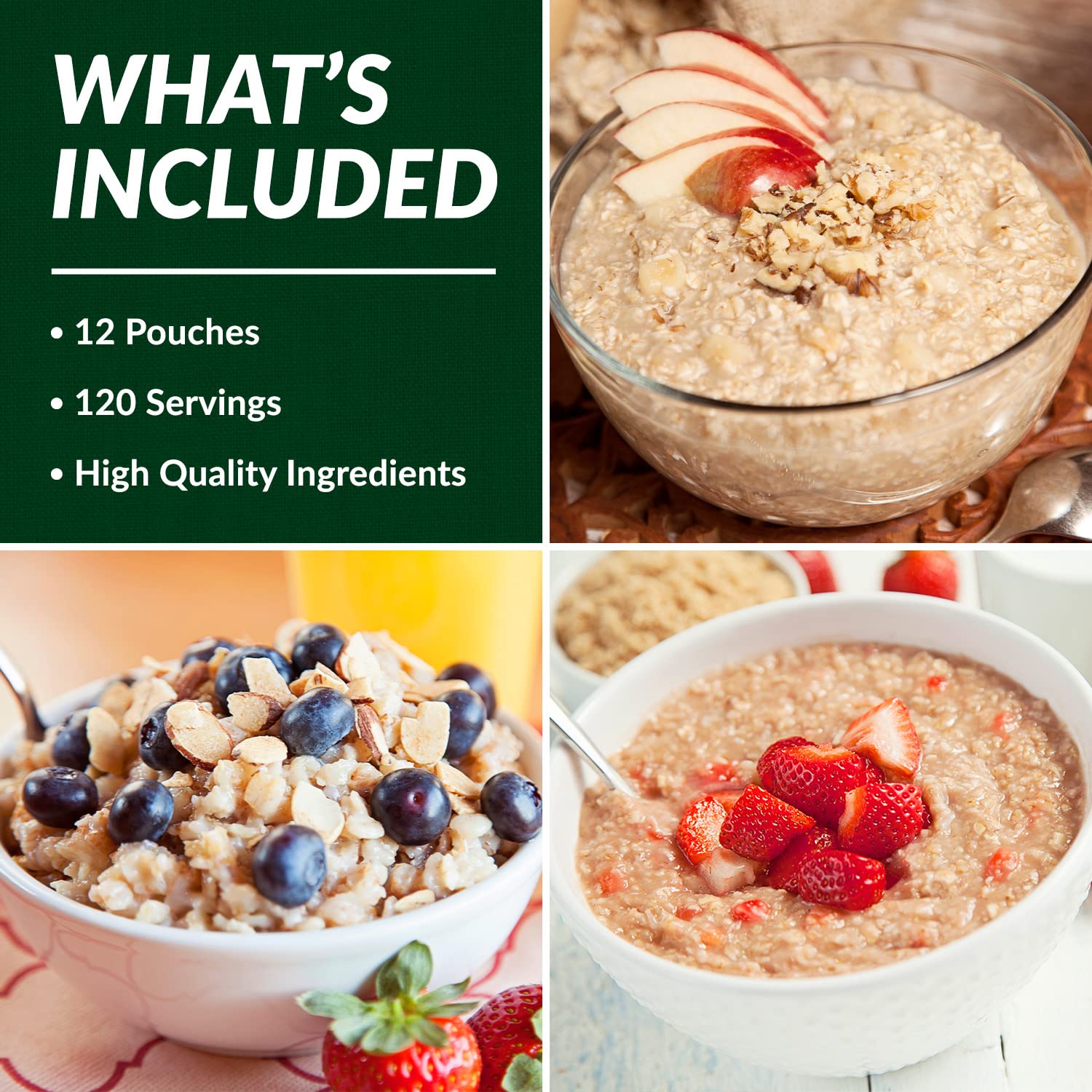 - INCLUDES: 12 pouches of our delicious and nutritious breakfasts, such as maple brown sugar oatmeal, strawberry creamy wheat, or multigrain cereal, totaling 120 servings of shelf stable food.