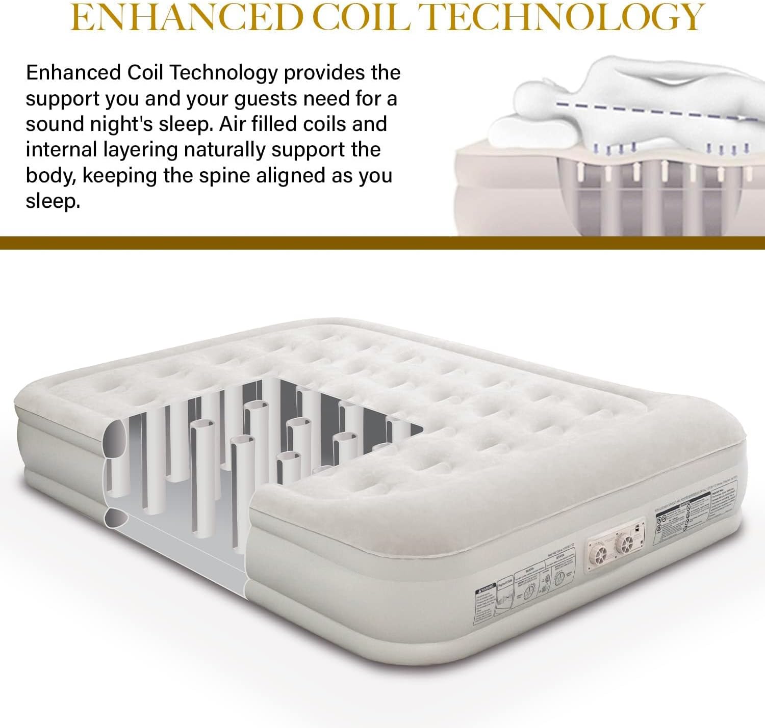 - KING KOIL is a premium luxury air mattress and offers a 1-year manufacturer warranty: Experience unparalleled comfort with our Queen-sized airbed, featuring a luxurious pillow top, soft flocking layer, and enhanced coil-beam construction for maximum support. This air mattress is your go-to solution for a restful night's sleep and is built to last with durable, waterproof, and puncture-resistant materials.