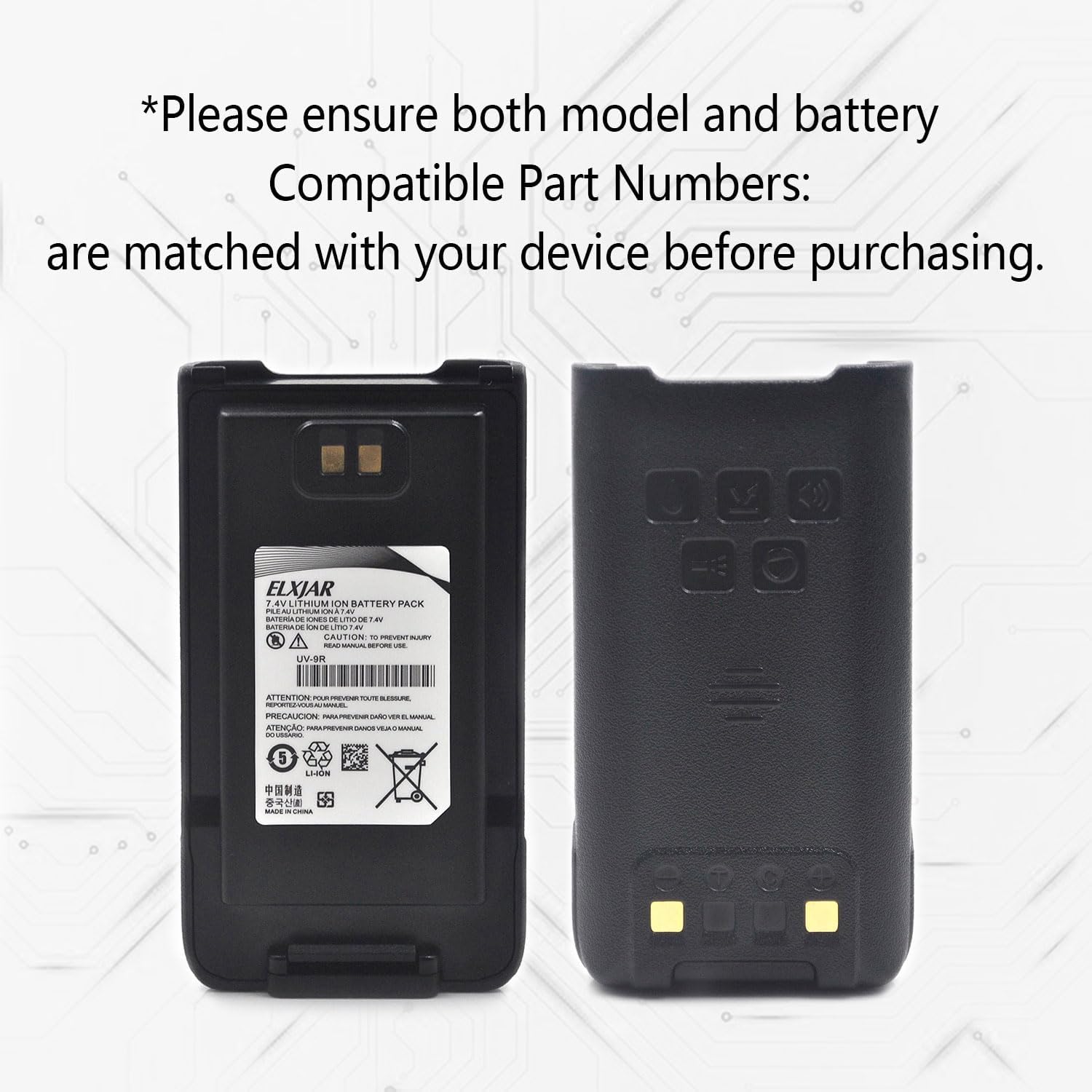 - Reminder: Since there are multiple versions of the UV-9R, and the batteries are not universally compatible, please make sure to carefully check the main image of the listing. Pay special attention to the five icon positions on the back of the battery, as well as the four horizontal lines located in the center. For this battery, the pattern of the horizontal lines is short–long–long–short. Please be sure to compare this detail with your original battery before placing an order.