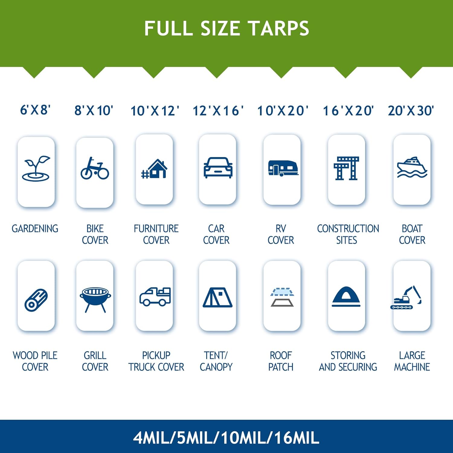 - 【Finished Size】Our versatile tarp comes in sizes ranging from 6 x 8 feet to 20 x 30 feet, with options in various colors and thicknesses to suit your needs. Choose from 5Mil for lightweight, short-term protection; 10Mil for medium-duty tasks and everyday shelter; or 16Mil for heavy-duty construction and long-term use. Perfect for outdoor activities or home projects, the SUNLITAP tarp delivers strength, portability, and exceptional value