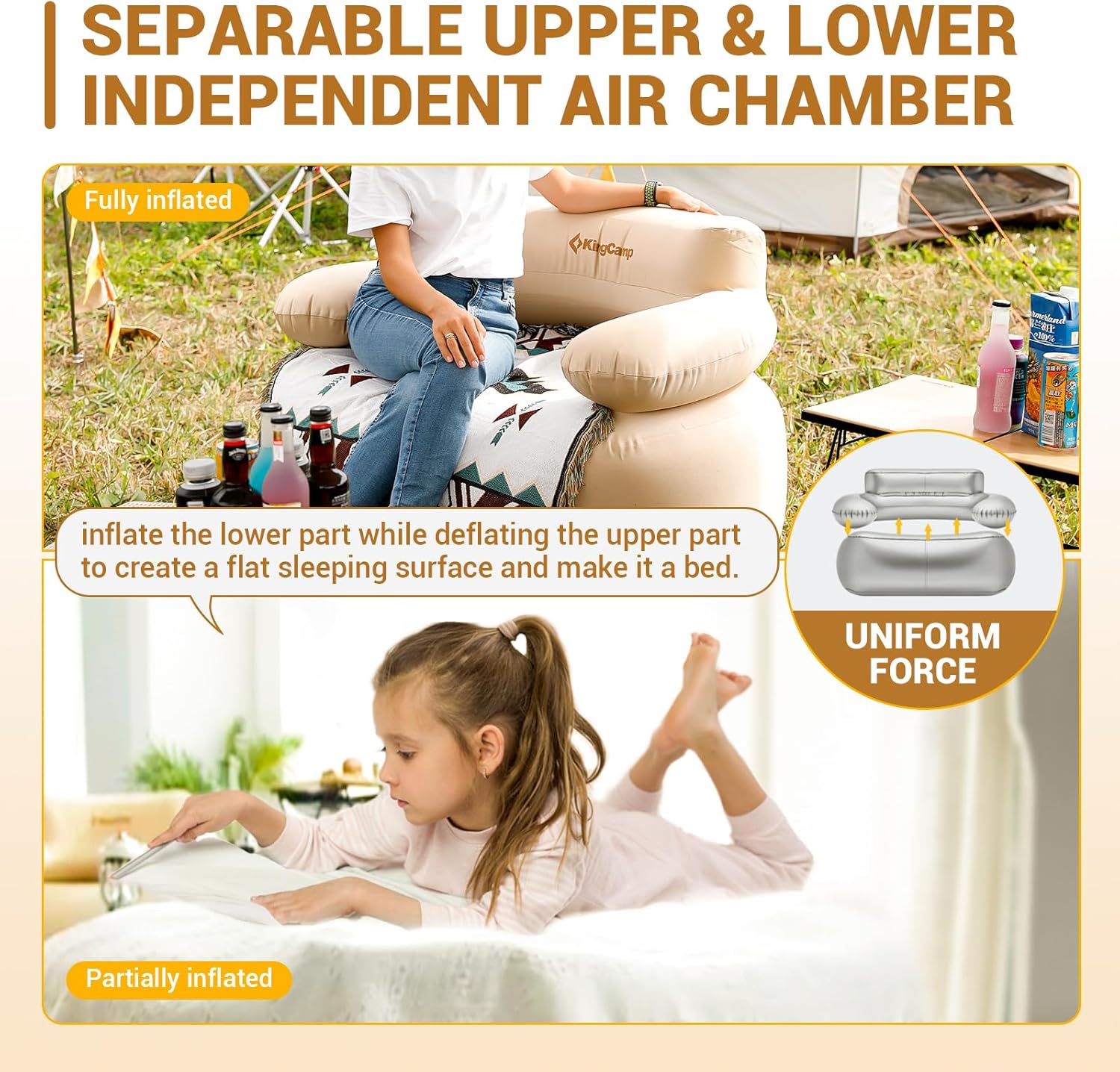 KingCamp Inflatable Couch for Camping, Portable Foldable Eco-Friendly Reach-Certified PVC Liner Air Lounger Blow Up Sofa with Foot Pump, Pegs, Repair Kit & Removable Cover