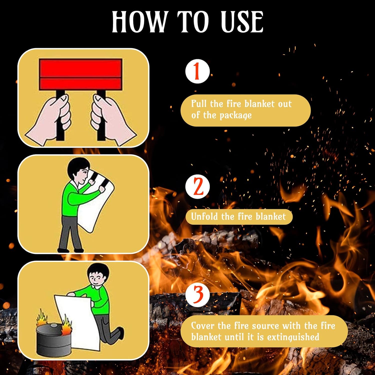 - Easy to Use: simply pull down tabs on the fire blanket kitchen, spread the blanket wide and slowly cover the fire; Let the emergency fire blanket sit there for a few seconds to suffocate the fire, turn off the stove or any heat source