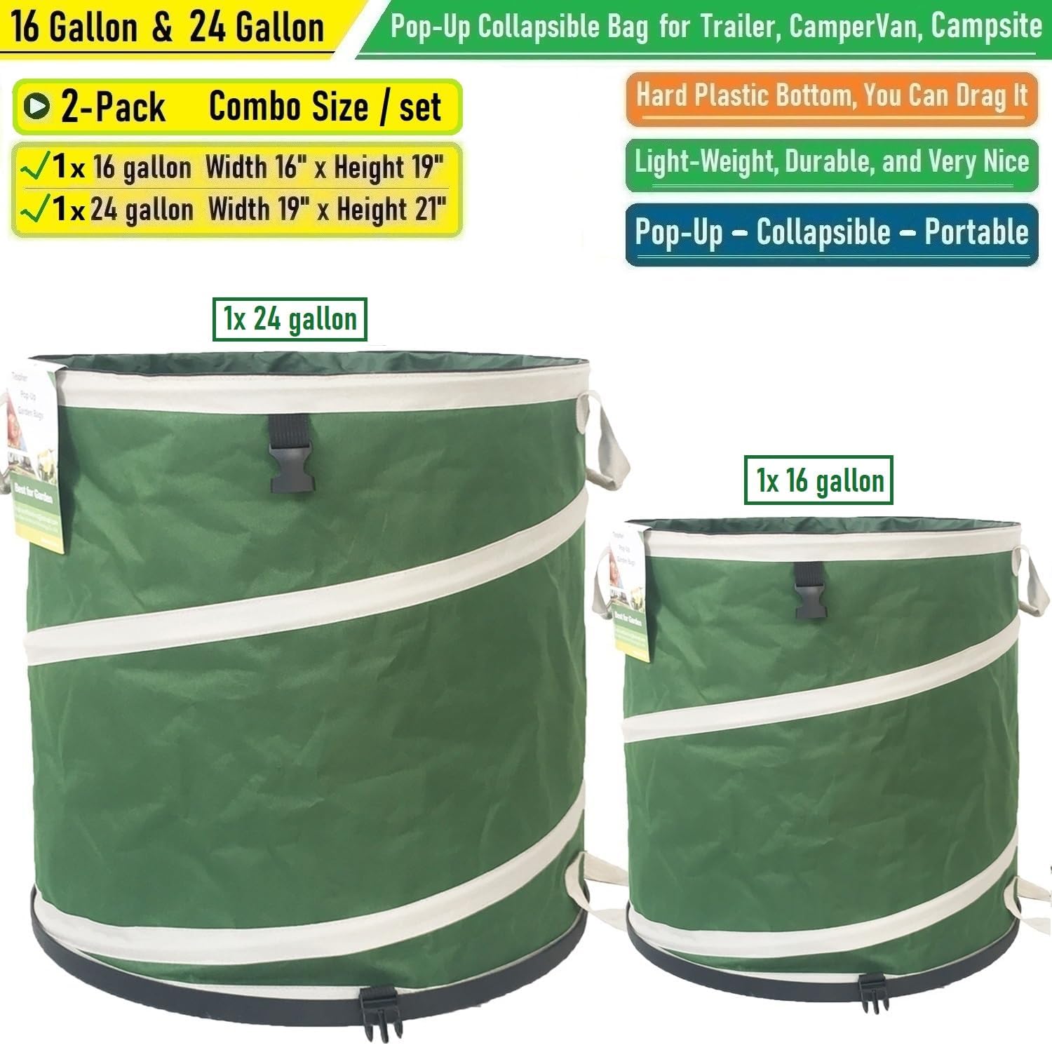 - 2-Pack, 16 Gallon and 24 Gallon Collapsible Trash Can with Solid Bottom, Collapsible Yard Garden Bag with Drawstring Cover: The collapsible pop-up garden bag has a hard shell plastic bottom, you can drag it on the ground as you want; You will have less stress on yard garden works; Very handy, Sturdy yard waste bag; It's great for leaf bag,lawn debris,yard waste disposal and debris removal,household trash container,kitchen waste bin,pop-up trash can,office recycle bin,workshop trash container