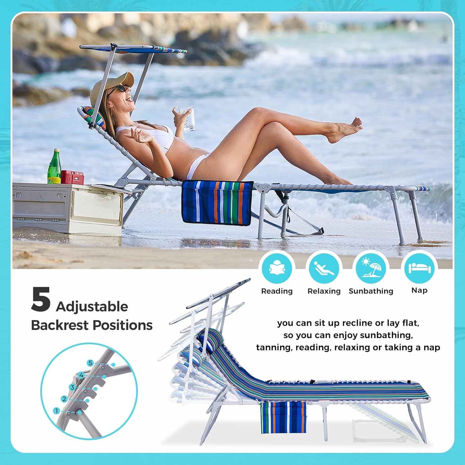 - 【Adjustable Angle Sun Shade】Coming with canopy shade, the beach lounge chair for outside allows you to adjust its angle according to the changing position of the sun. The shade can be moved to block the sun or lowered so you get full sun. The canopy makes it possible to shade your head and eyes when reading, and you don’t have to wear a hat any more! The beach lounger is great for keeping the sun off of your face, and enables you to play games while sunbathing.