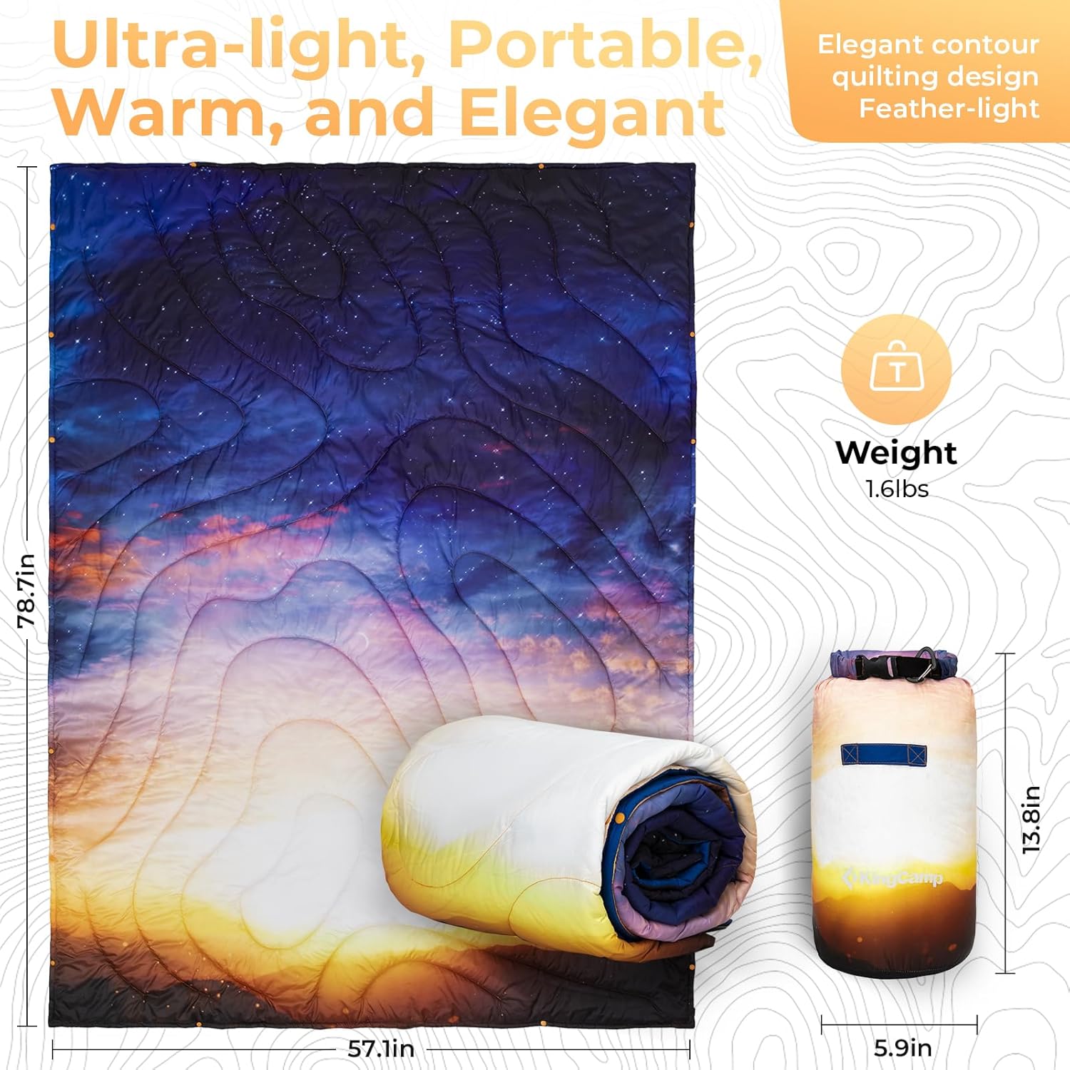 - LIGHTWEIGHT & PORTABLE - WARMTH ON THE GO: This camping blanket unfolds to a spacious 79"L × 57"W and weighs only 1.63 lbs-lighter than a bottle of water. It offers full coverage without the bulk. It compresses down to 13.8" × 6.7" × 6.7" in the included double-drawstring stuff sack, making it the ideal packable blanket for travel, backpacking, hiking, or road trips. Stay warm anywhere, anytime.