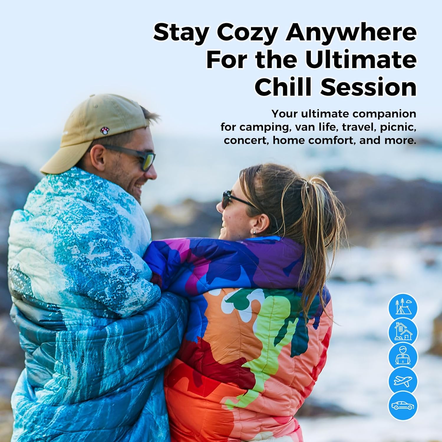 KingCamp Ultralight Camping Blanket, Packable Down Alternative Puffy Printed Wearable Blanket with Snap Buttons & Corner Loops Weatherproof Quilt for Outdoor Travel Stadium (79"L x 57"W SEAWAVE)