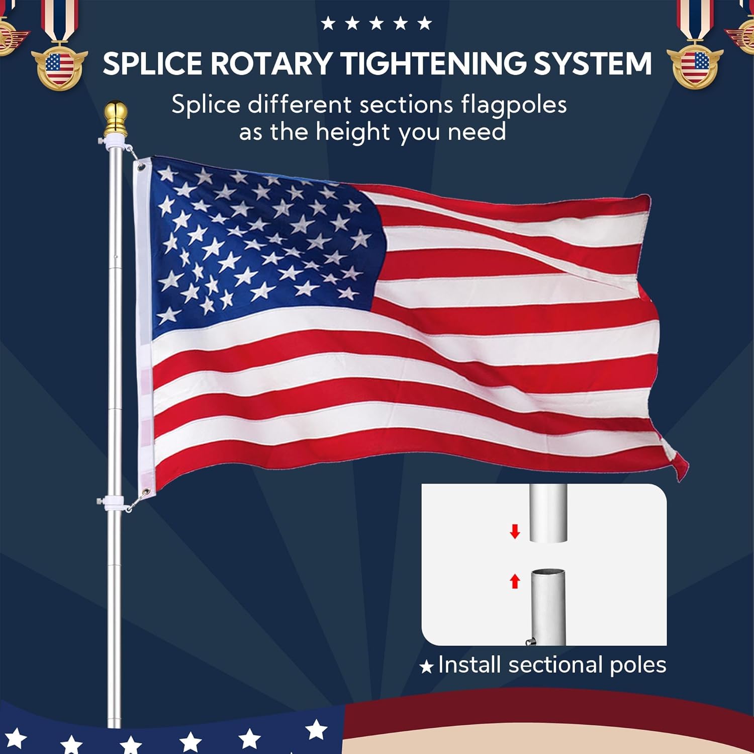 - [Easy Assembly]: Easy to assemble in minutes by connecting the sectional poles, sliding the rotating rings into the top pole, and hanging the national flag; Comes with a PVC sleeve to give the flagpole a firm foundation for better stability
