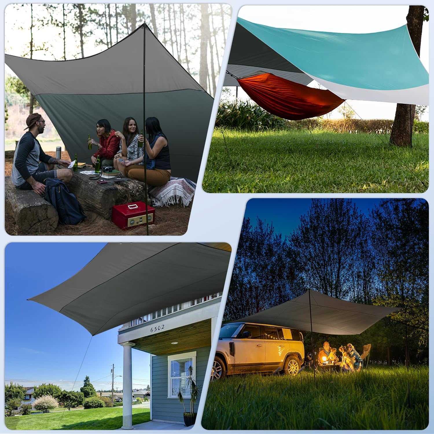 - Both for Rain or Sun: Camping Tarp made of 210T ripstop polyester fabric with 3000 PU waterproof rating, enhanced the shelter's waterproof function and offers long-lasting protection, good water resistance can be used to protect you from rain on rainy days and ensure you can relax better during the trip.