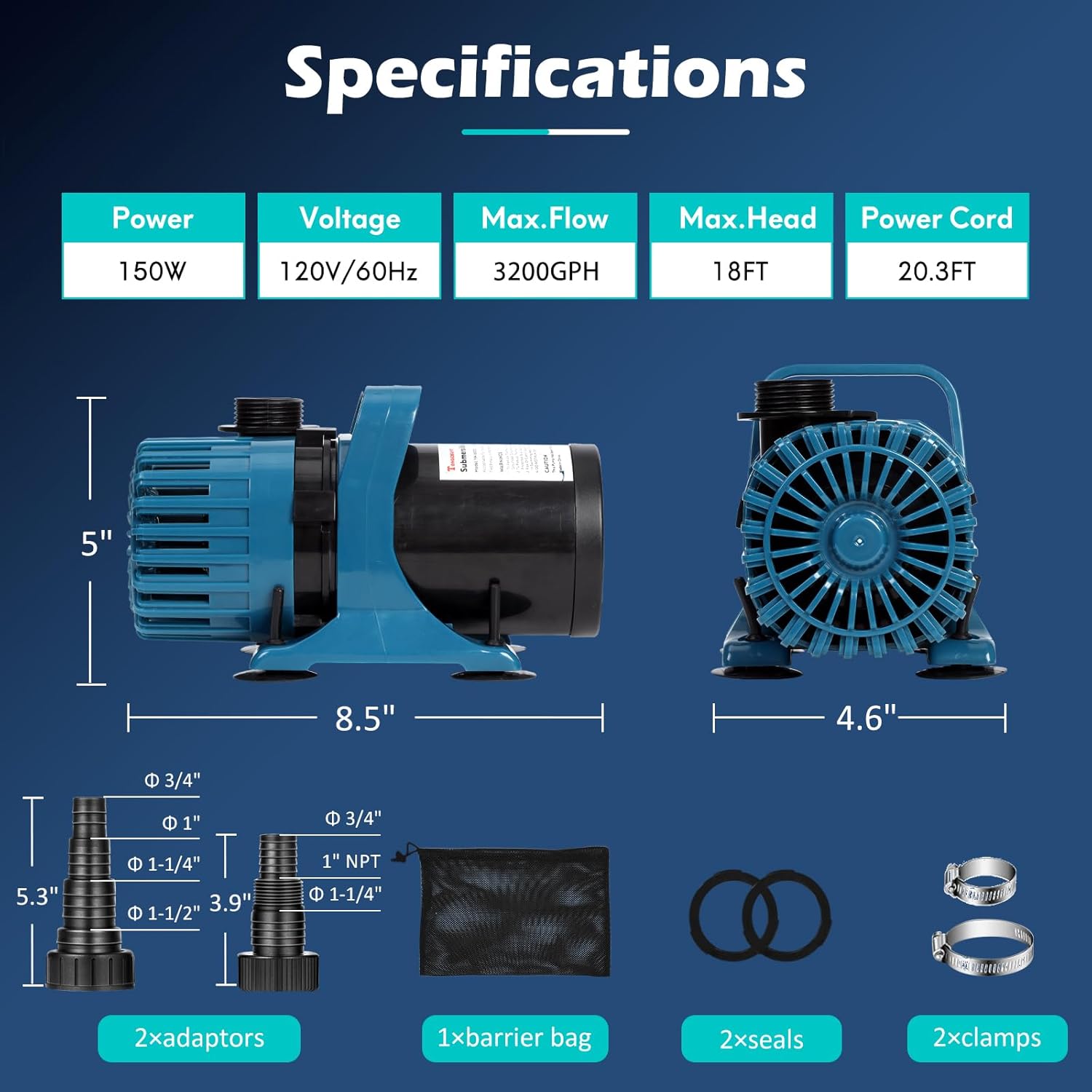 - POWERFUL POND PUMP: This 150W submersible water pump delivers 3200 GPH and lifts water up to 18ft, making it the perfect koi pond pump or fish pond pump for backyard fountains, waterfalls, and other pumps for ponds applications. It works well submerged or on land (best submerged).