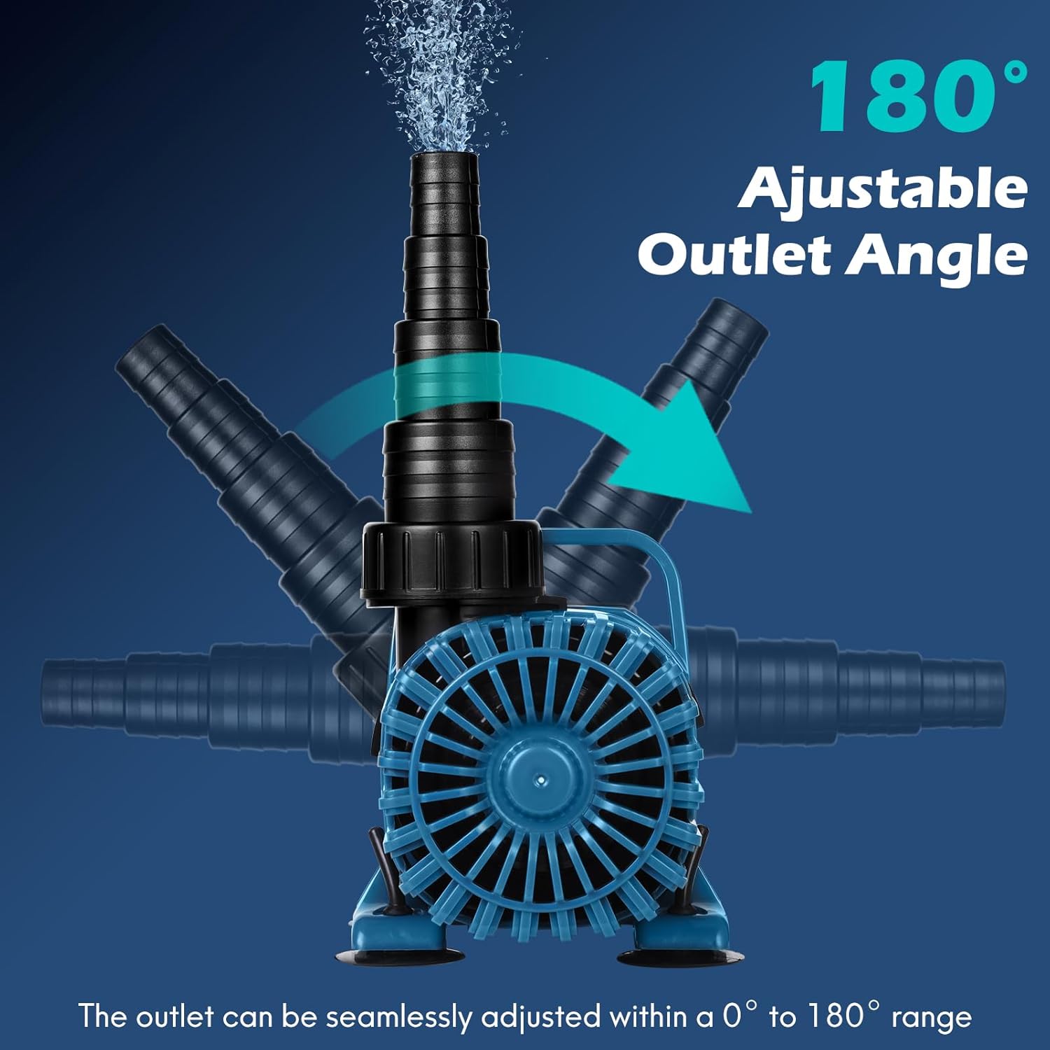 - ADJUSTABLE OUTLET FOR CUSTOM FLOW DIRECTION: The 180° seamless adjustable outlet allows you to change the direction of the water flow with ease. It’s ideal for use as a pond fountain pump where you need to direct water toward specific features in fountains, waterfalls, or garden setups—making it simple to guide the flow without affecting flow rate.