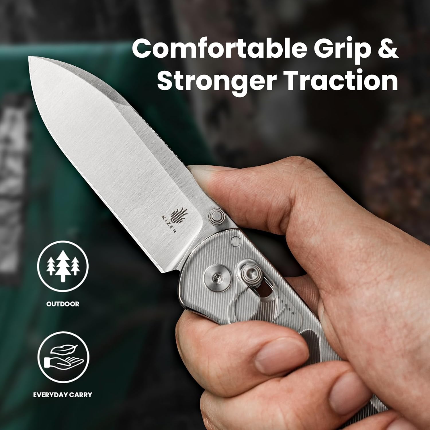 - Ergonomic Grip - Textured grooves on the handle provide a tactile sensation and increased friction surface. Long jimping along the spine enhances control over the blade. Kizer folding pocket knives offer improved grip for an enhanced user experience.