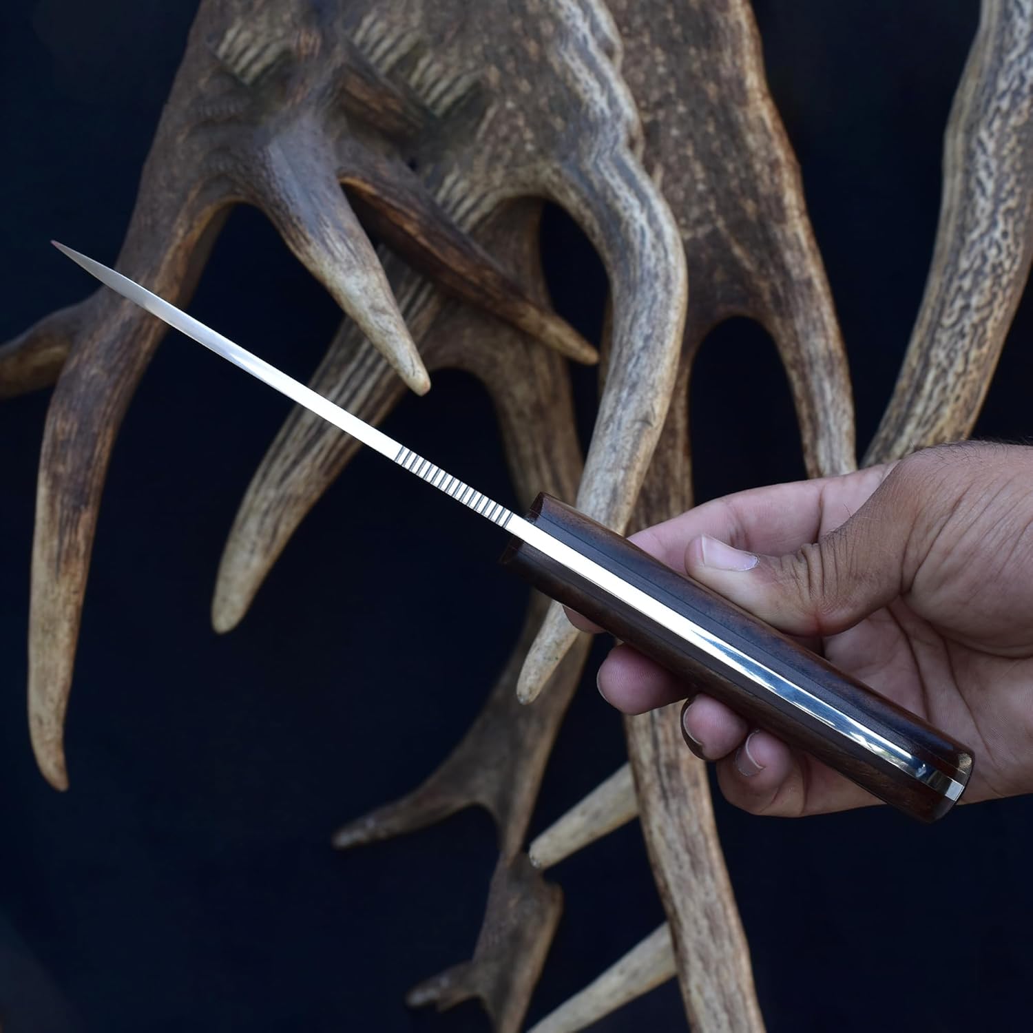 - Strong & Secure Grip: Stabilized Rosewood Burl with Micarta Fiber Liner handle is egronomically crafted for comfortable grip. The handle is designed for a very secure and strong grip. It will not create any fatigue during prolonged usage in the field. Moreover, the spine of the blade features precise jimping that will provide a better control.