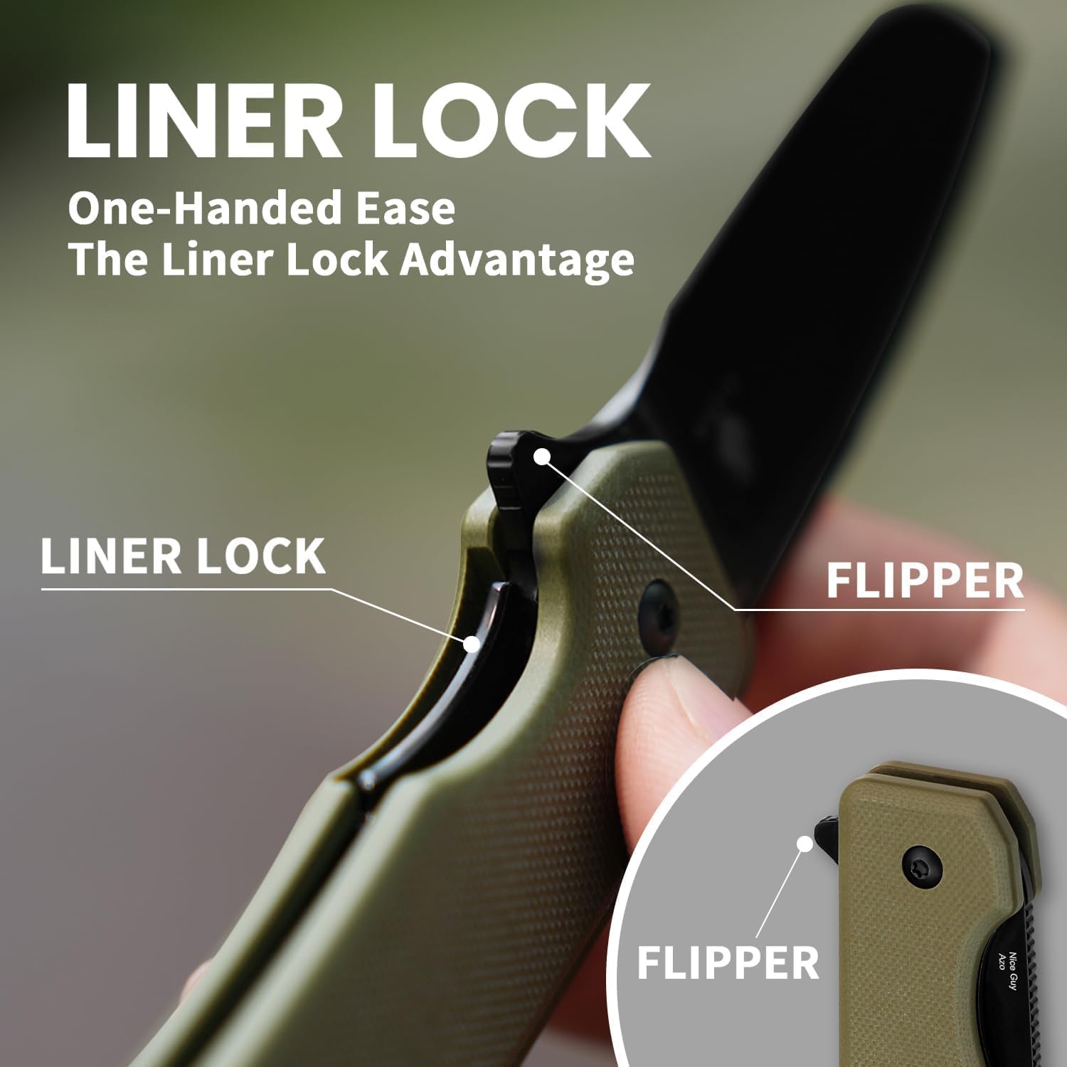 - 【Ergonomic Design】The combination of Flipper and Liner Lock enables convenient one-handed opening and reliable blade security. The Flipper allows easy deployment, while the Liner Lock ensures a secure hold, preventing accidental folding. This design enhances maneuverability, comfort, and safety.