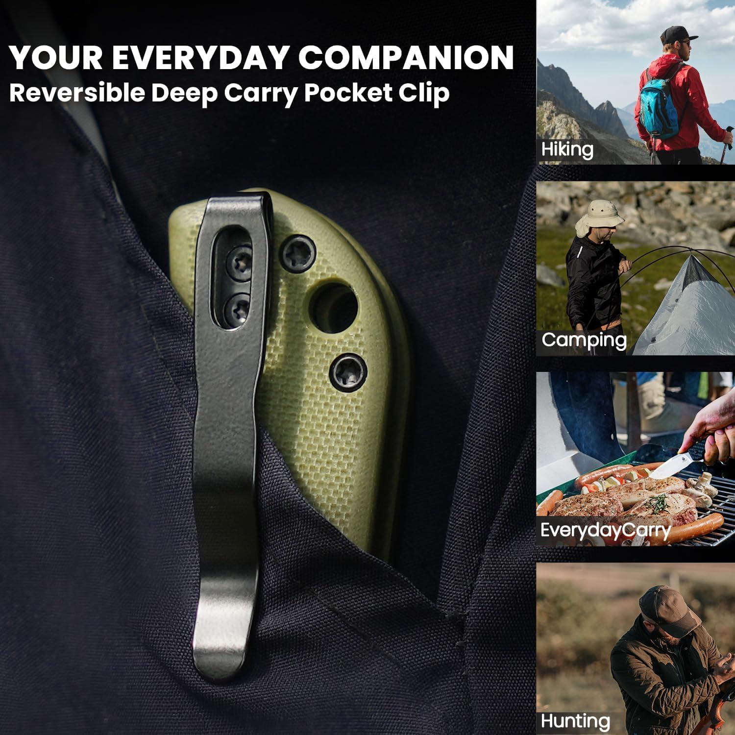 - 【Drop Point】Drop Point blades are renowned for their sturdy tip, pronounced belly, and excellent control. They are versatile for various cutting tasks, whether for outdoor adventures or everyday use.