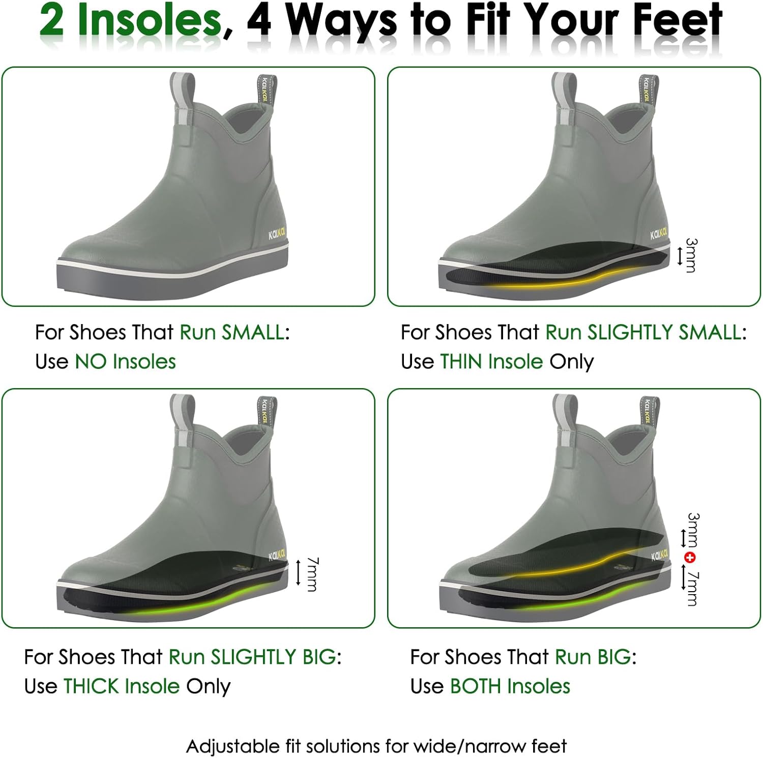 • ๐Ÿ‚๐Ÿ‚With 2 Pairs of Insoles: KALKAL waterproof men boots provide two pairs of insoles to offer personalized comfort, the ankle rubber boots for accommodating various foot types and preferences for a tighter or looser fit, ensuring customized comfort and arch support
