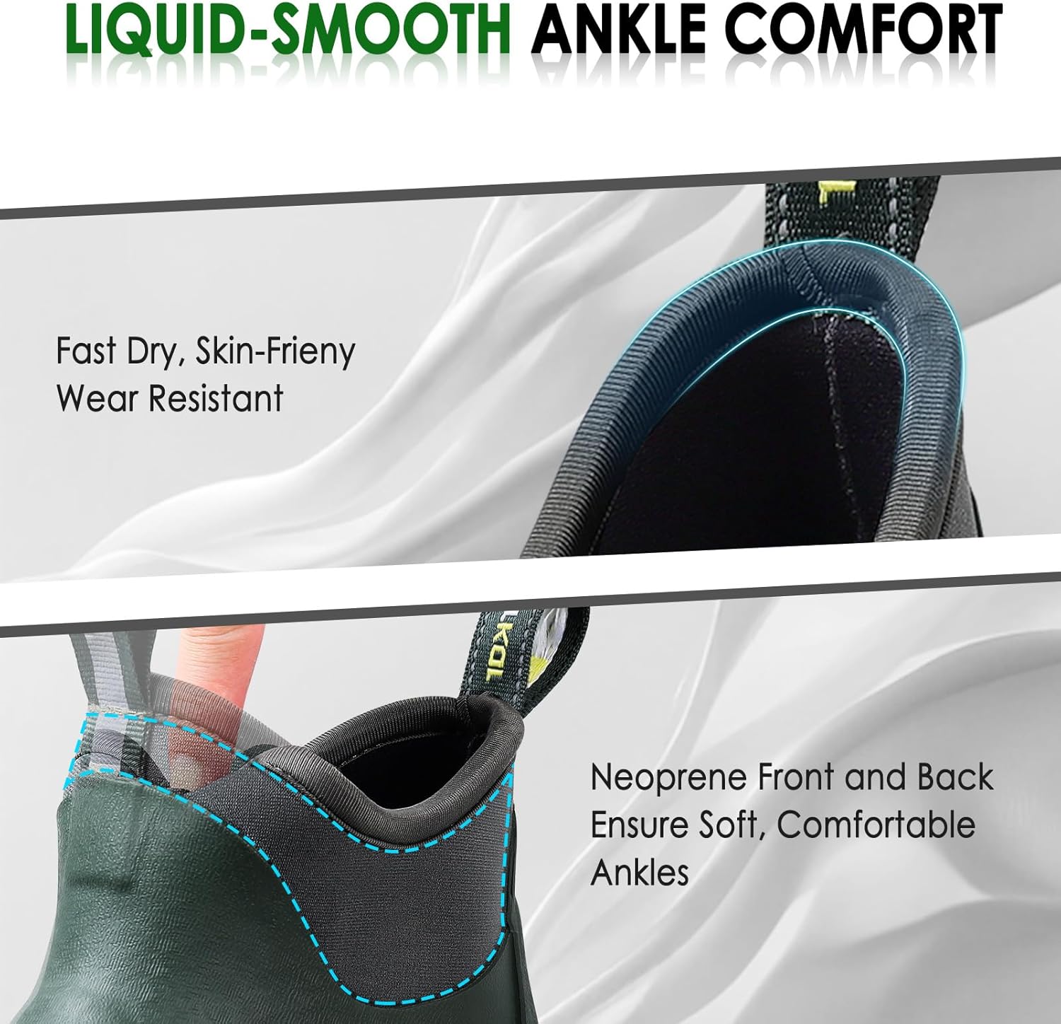 • ๐Ÿ‚๐Ÿ‚Thoughtful Boots Opening Design: The opening of deck boots features quick-drying, wear-resistant fabric edging that is skin-friendly, the pure neoprene at the front and back ensures soft, comfortable ankles while squatting or walking. Reflective webbing adds safety
