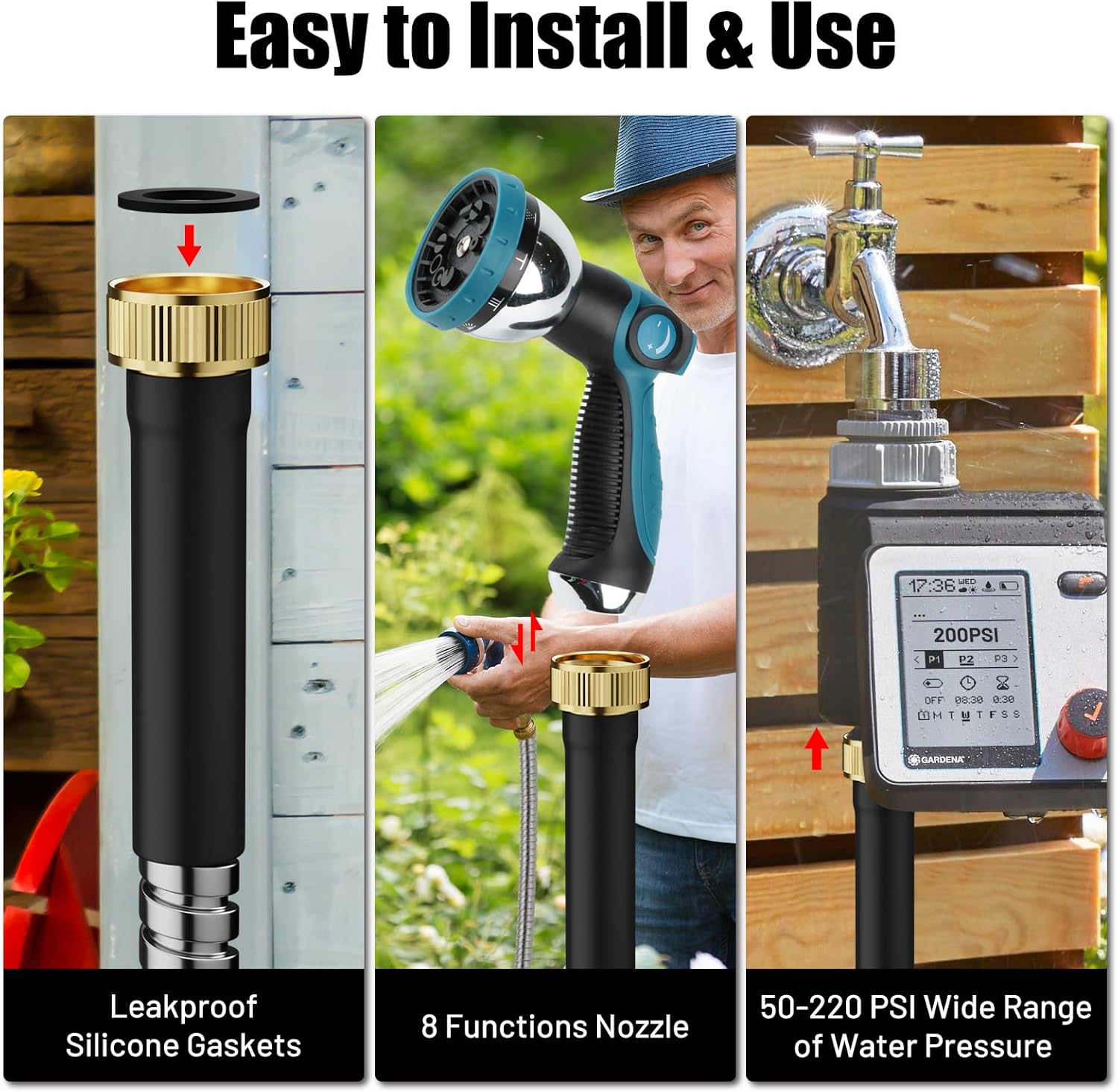 - Functional nozzles - Metal hose (3 feet, 5 feet, 10 feet, nozzle not included); The nozzle (included in the 25-foot, 50-foot, 75-foot, 100-foot hose) is equipped with an ergonomic non-slip rubberized handle. Use your thumb to turn on the switch to control the flow of water, no need to squeeze the trigger handle too hard so this kind of nozzle won't put pressure on your fingers.