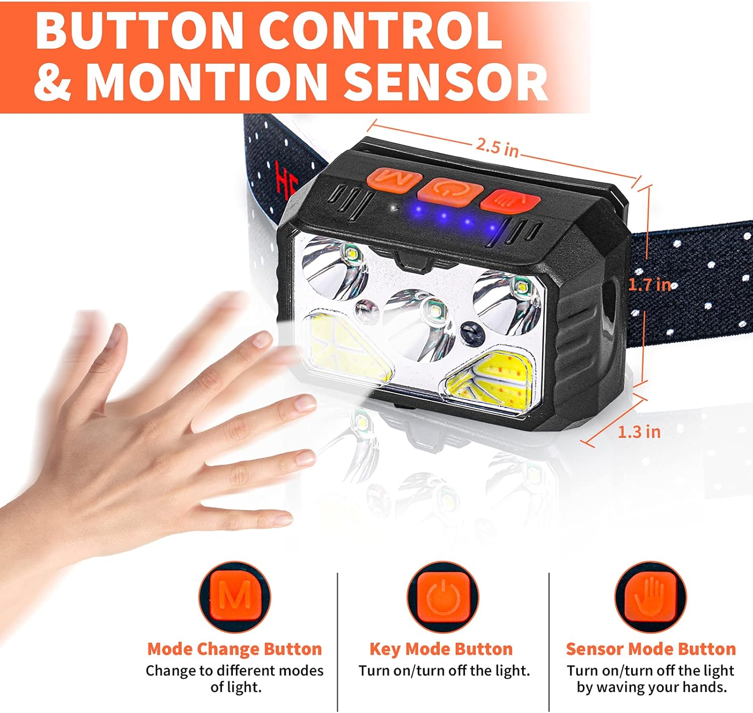 - Humanized Design: Our headlamp have one-button on/off and induction on/off function.You can choose the on/off control mode according to your using habits in different scenarios .can easily turn the lights ON/OFF by waving your hand,or press the power switch turn the lights ON/OFF in no time.