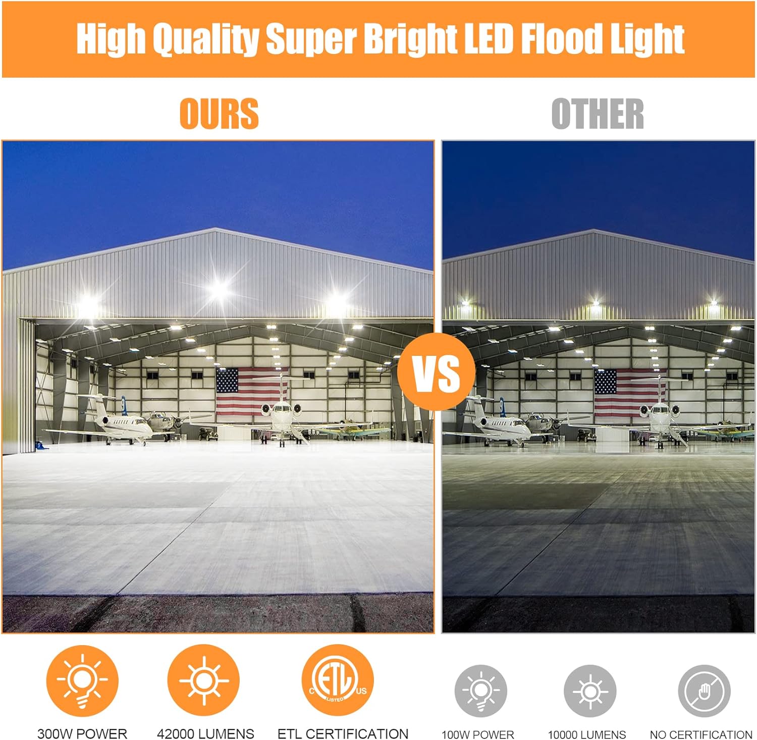 - SUPER BRIGHT & ENERGY SAVING: 300W LED stadium light Fixture provides 33600 Lumens at 5000K Daylight, which is 20% brighter than other lamps. The LED flood light operates on 100-277 VAC and is designed to last 6 times longer than MH fixtures, which can save 85% of electricity cost. Great choice to replace traditional flood light bulbs.