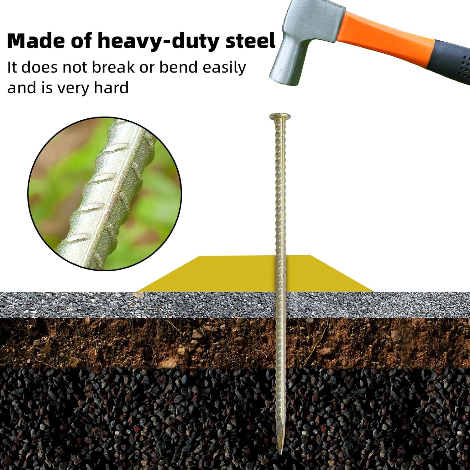 - RIBBED AND YELLOW GALVANIZED: These rebar piles are made from malleable steel material. The yellow galvanization helps to avoid rust and helps to last for many years. Ribbed ground anchors are strong, sturdy, and warp-free to withstand any weather and ground