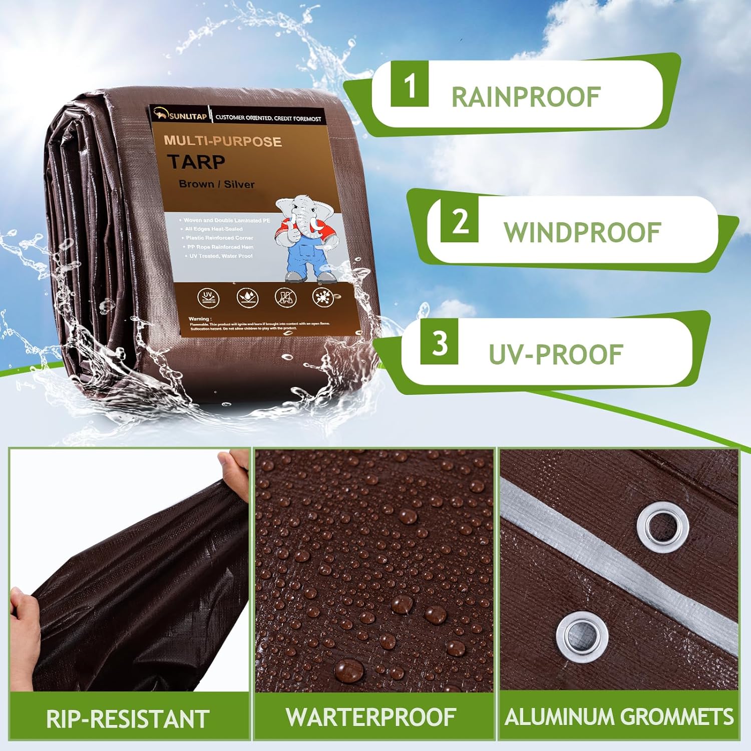 - 【MULTIPURPOSE USE】SUNLITAP waterproof tarp has a wide range of applications. Whether you need ground covers, tent flooring, RV and boat covers, backyard sunshades, or protection for damaged roofs and outdoor furniture, it offers the perfect coverage! It can also provide campers with a shelter from the wind, rain, or sun. Regardless of the application, our tarps offer a sturdier, more durable solution for long-term coverage or protection needs