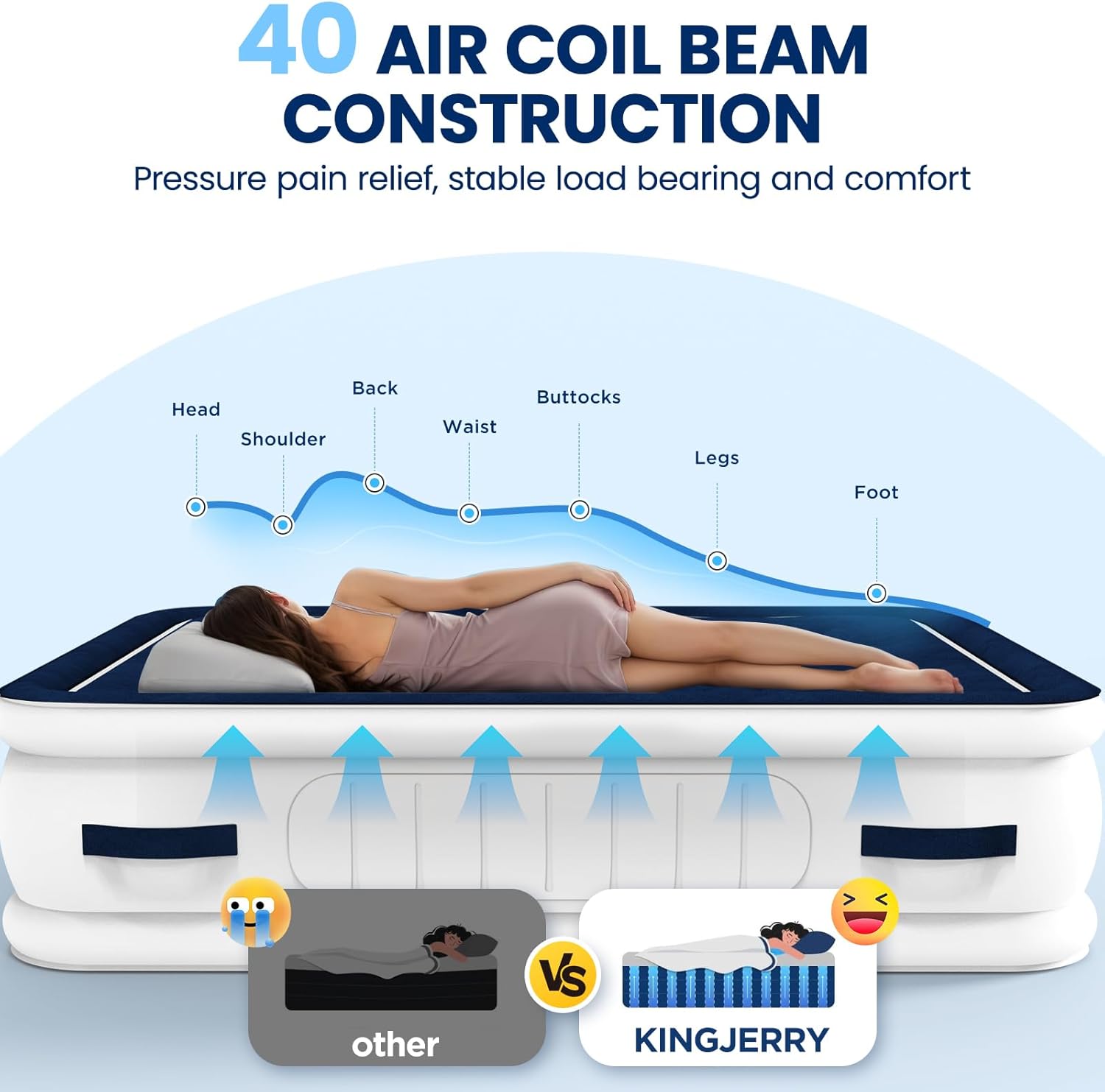 - Luxury Comfort Experience: KINGJERRY air mattress top layer is made of velvet-like flocking material, soft and gentle on the skin; Lying on the air mattress, the body is surrounded by a delicate touch like clouds, and fatigue gradually dissipates, air mattress queen with built in pump allowing you to enjoy comfort and restful sleep all night