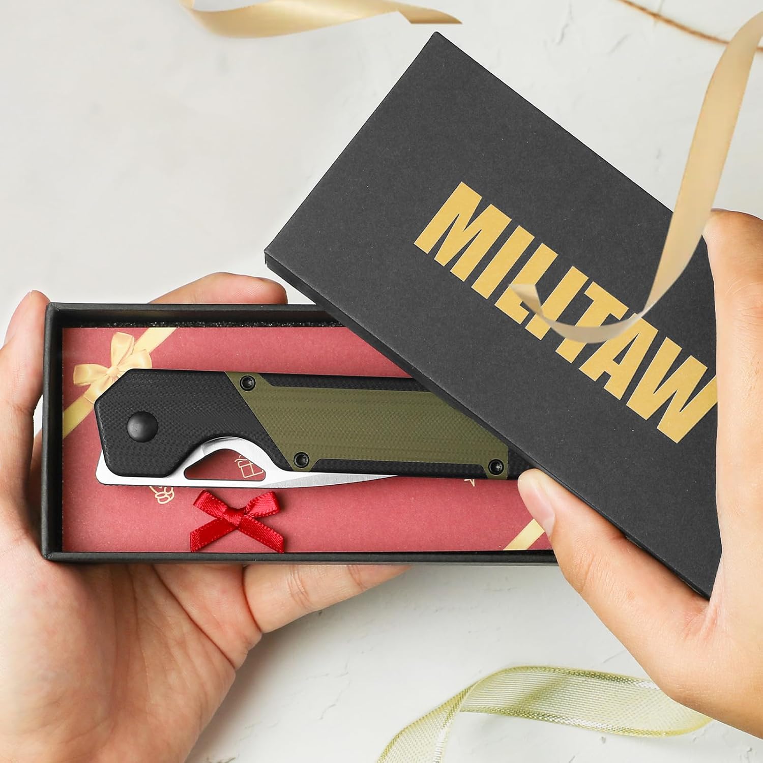 - Two-toned G10 Handle: Militaw edc knife uses Green & black two-toned colored G10, which provides both a stylish appearance and a secure grip. The handle patch inlay can be easily replaced, DIY your folding knife handle. Militaw pocket edc knife handle also features a well-chamfered handle edge.