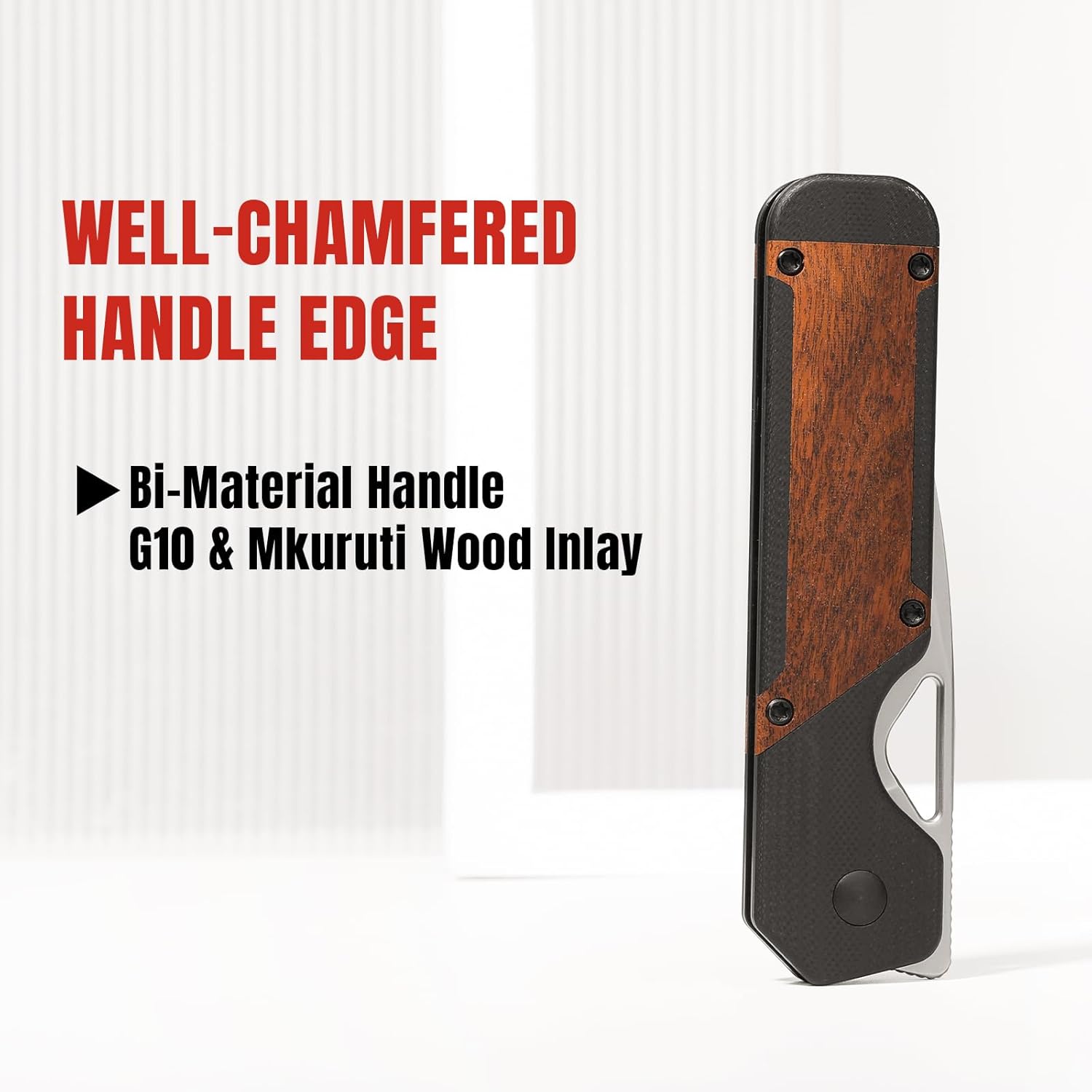 - Stylish Bi-material Handle: Militaw edc knife uses Mkuruti wood inlay on black G10 handle to combine the properties of two materials, taking into account overall aesthetics, comfort, and improved environmental adaptability. The handle patch inlay can be easily replaced, DIY your folding knife handle. Militaw pocket edc knife handle is designed with well-chamfered edges for a comfortable and stylish grip.