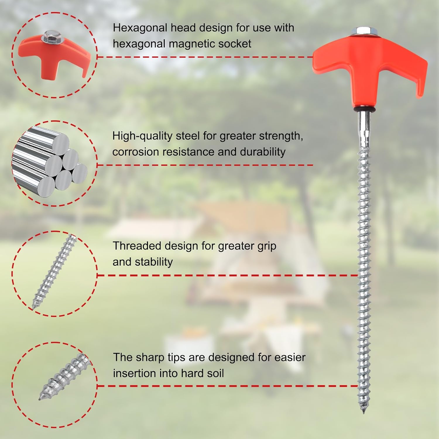 - Effortless Installation: Screw-in design allows you to spend less time setting up and more time enjoying your camping. Simply use a cordless drill or impact driver to secure your tents, canopy, awning, gazebo or tarps in seconds