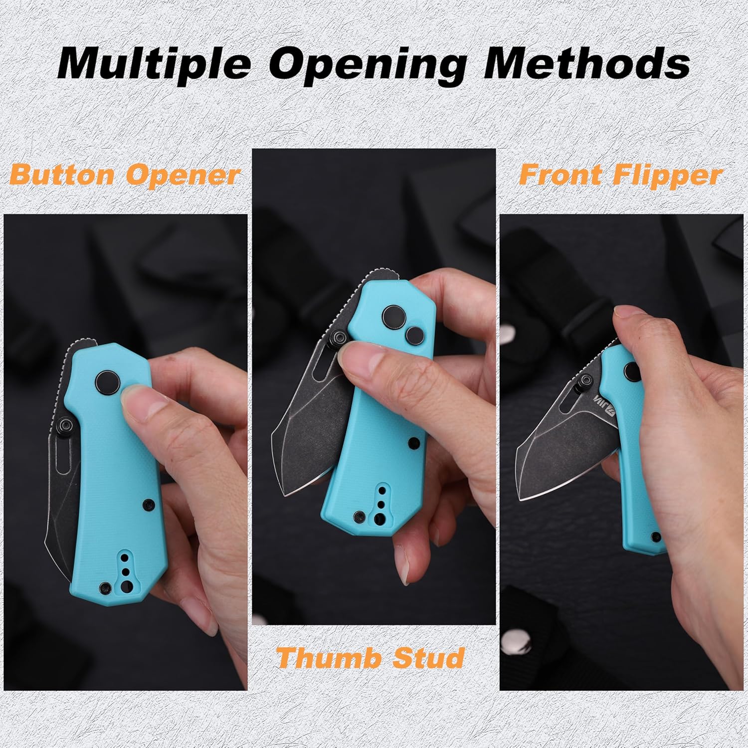 - Ultimate Fidget Knife - Ceramic ball bearings make the pocket knife snappy action. Pressing the button drops the blade shut seamlessly. Open the pocket knife with front flipper, button opener, reversible thumb stud/hole. Great EDC knife for both right and left-handed users.