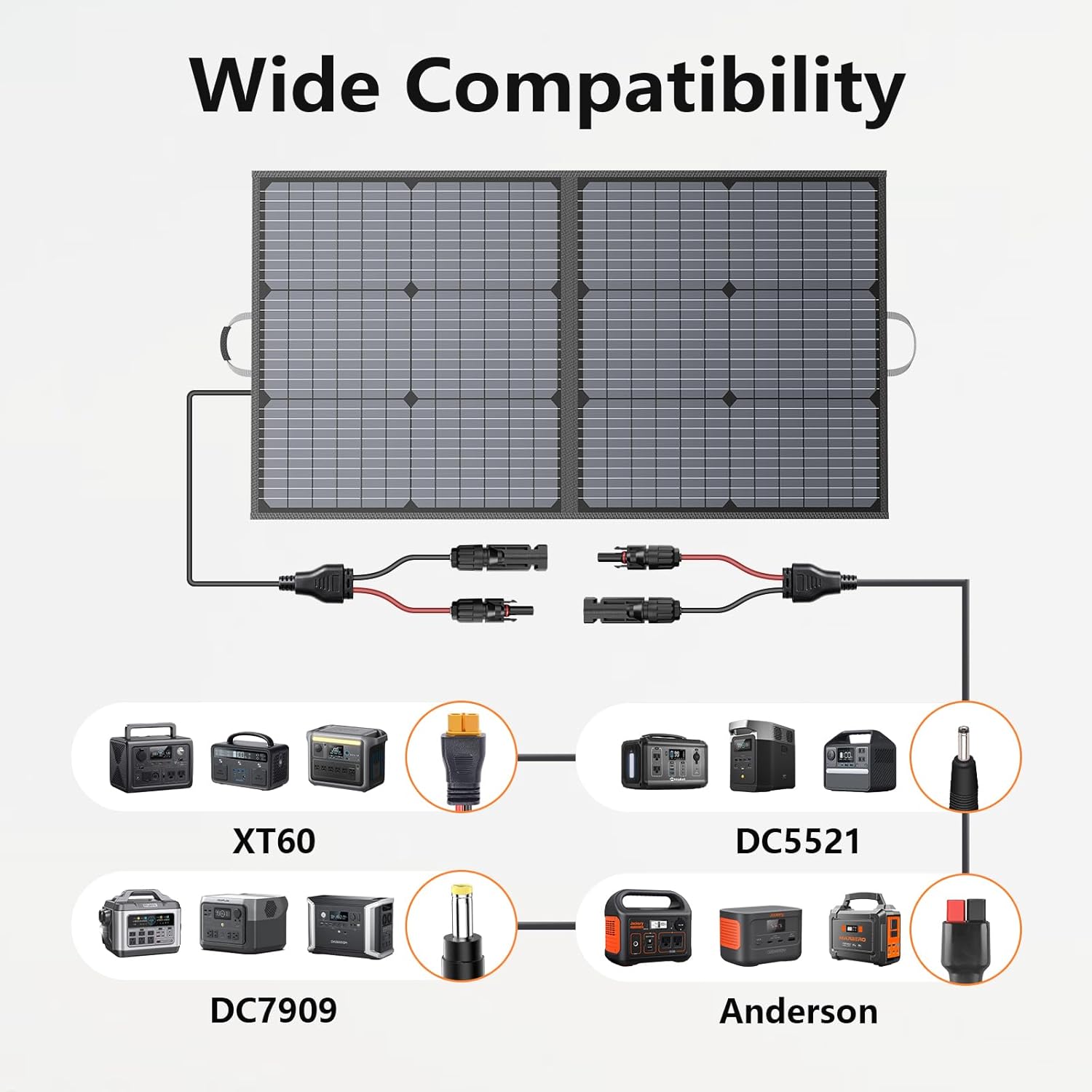 - 【Please Note】Some portable power stations have a maximum input power limit. Even when using our 110W solar panel in optimal sunlight conditions, the power they can receive won't exceed their maximum input power limit, which could be lower than 110W. But this does not indicate that our solar panel has insufficient power output. Please carefully verify your power station model and check if it has a maximum input power limit before placing your order