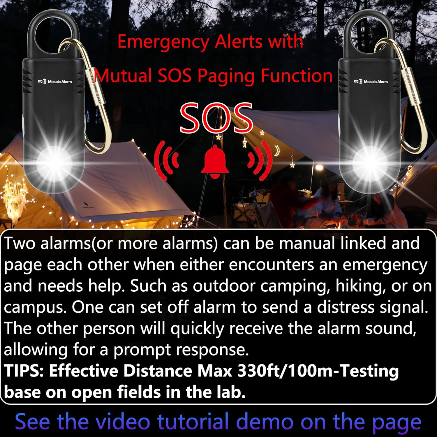 - 【Emergency Mutual SOS Paging Alerts】Two alarms(or more alarms) can be manual linked and page each other when either encounters an emergency and needs help. Such as outdoor camping, hiking, or on campus. One can set off alarm to send a distress signal. The other person will quickly receive the alarm sound, allowing for a prompt response. Effective Distance Max 330ft/100m-Testing base on open fields in the lab.