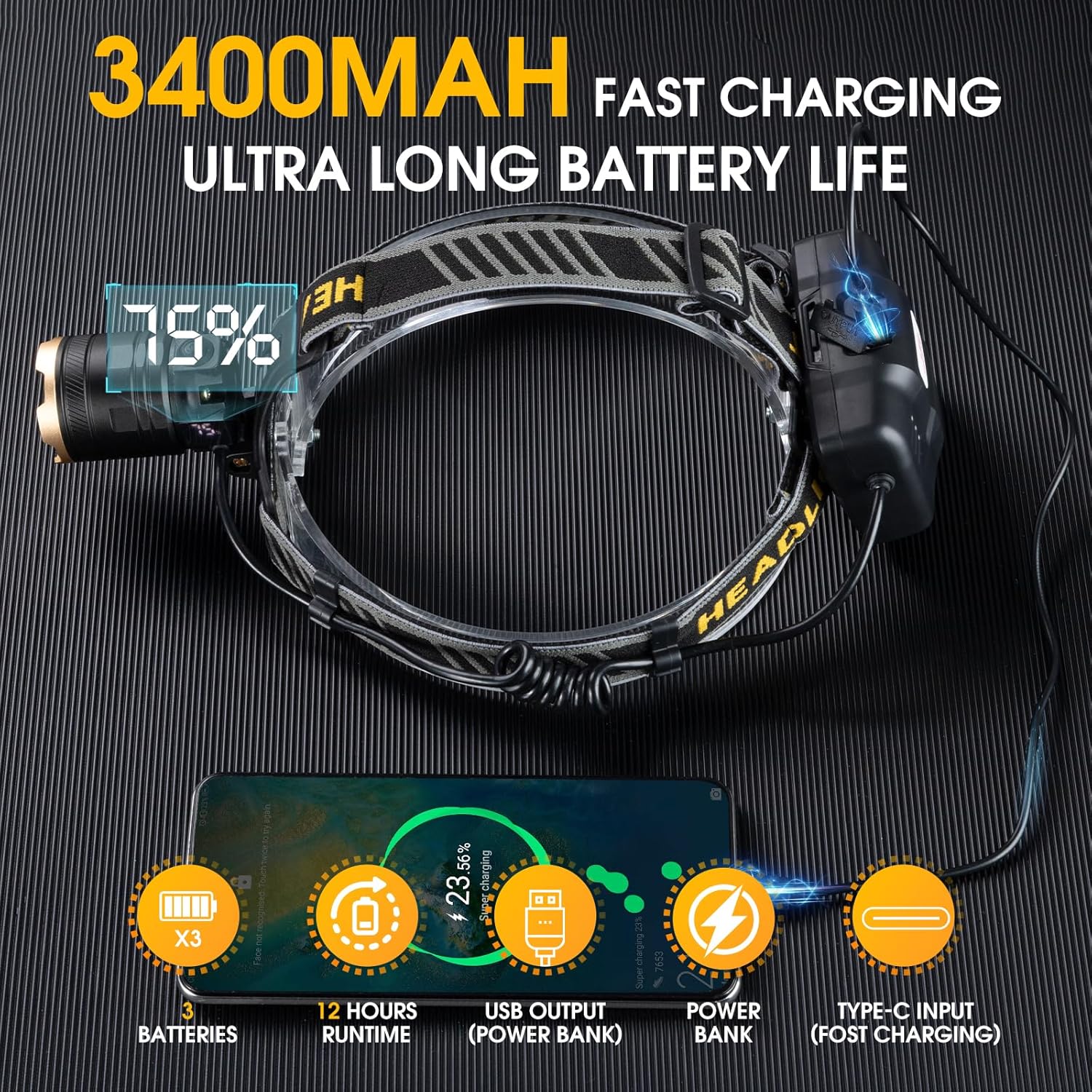 - Fast Charging and Portable Power Bank: Led headlamp rechargeable is equipped with 3x3400mAh rechargeable batteries. The headlamp has a Type-C fast charging port and USB output charging to meet various charging needs. The headlamps for adults rechargeable can be quickly fully charged within 2-3 hours. Led headlamp has a USB output port that can be used as an emergency power source for smartphones, PC or other devices